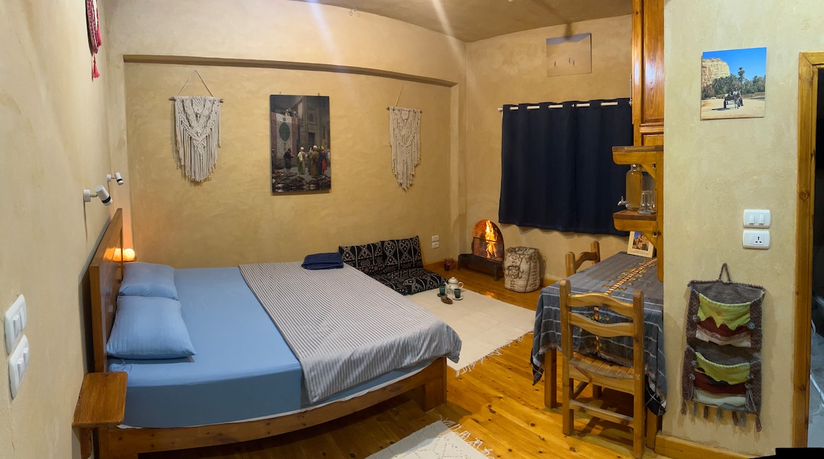 family or group suite . it has Trible room + double room with a shared bathroom and kitchen area and living area . maximum number of guests is 5. build on siwan style with eco friendly baskets made from Palm trees waste 🧺+ natural hot water from underground.