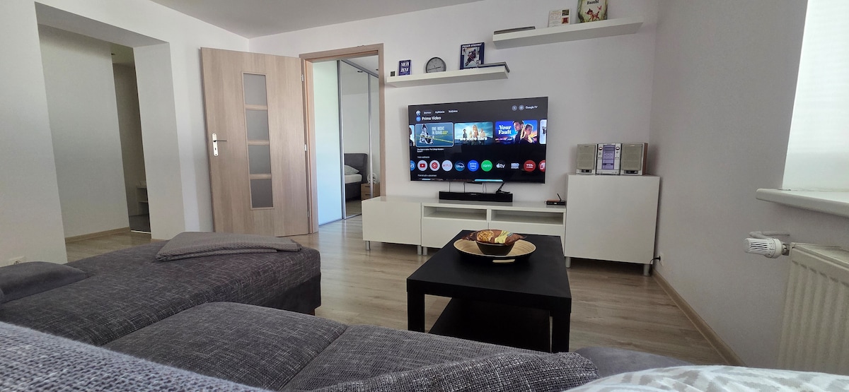 Piso limpio de 2 camas junto al Gáborík Arena, a pocos pasos del centro de la ciudad, la estación de tren y la estación de autobuses. Totalmente equipado para nómadas digitales, con Internet de alta velocidad (400 MB), es una estancia ideal para aquellos que asisten al Campamento Gáborík. Fácil acceso a atracciones locales, restaurantes y tiendas, perfecto para parejas, familias o trabajadores remotos. El estacionamiento no está incluido, pero puedes estacionar fuera del edificio de departamentos por 9 EUR por día, y hay un cargador para vehículos eléctricos frente al departamento.