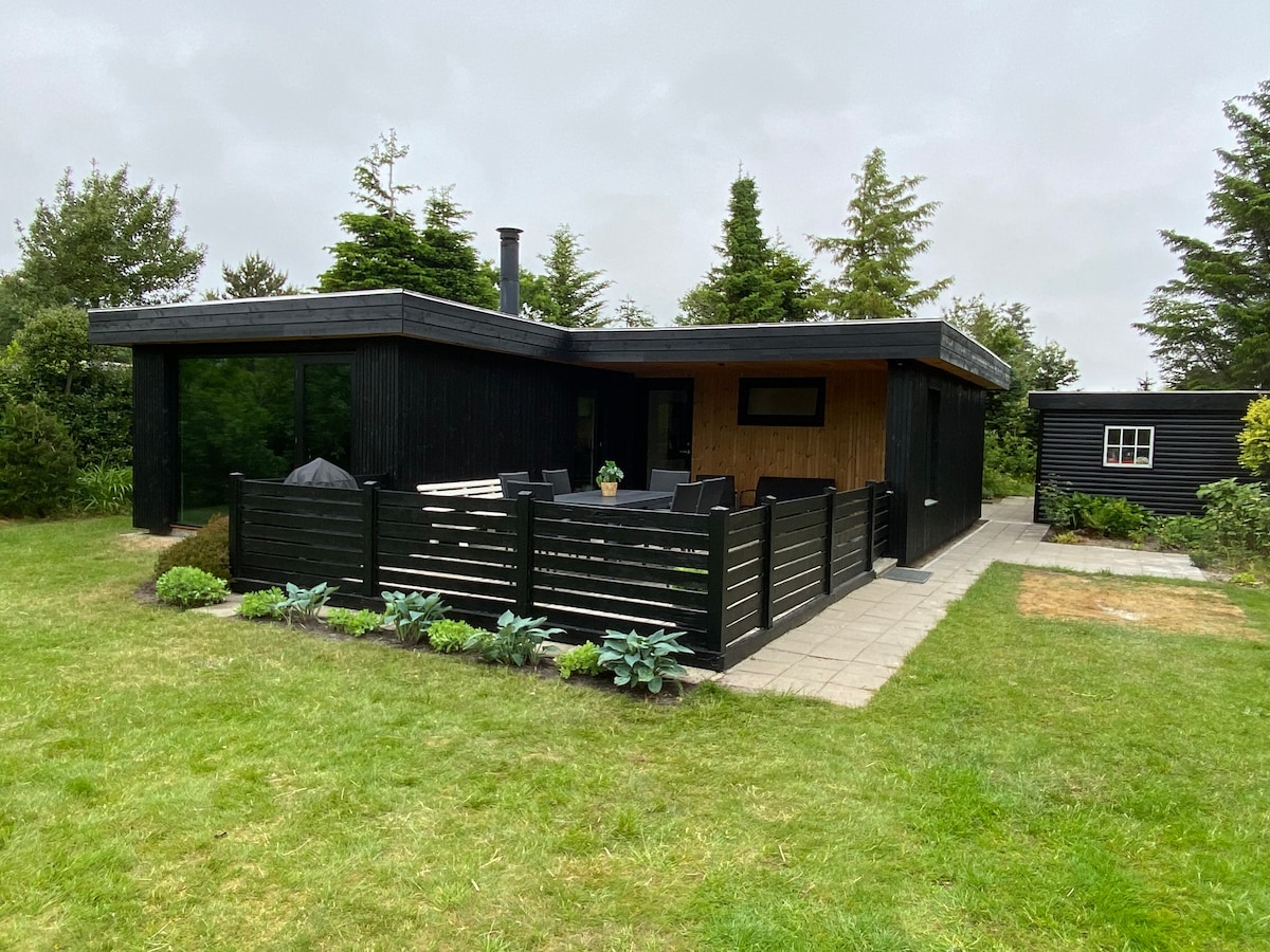 Visite esta idílica casa de madera totalmente renovada con un ambiente maravilloso. Situada en un gran terreno boscoso y ondulado en Skuldbøl. Un lugar agradable y tranquilo, con un entorno natural y una rica vida silvestre. Nueva terraza grande con cubierta en medio del bosque. A 8 minutos a pie del aire fresco del fiordo de Ringkøbing. La encantadora casa ofrece la hermosa naturaleza en su interior, y es agradable, que invita a unas vacaciones agradables y relajantes. Aquí hay paz y ambiente en las hermosas terrazas.