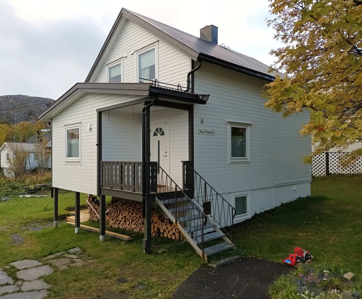 Casa grande en un entorno tranquilo, vistas panorámicas de todo Skjervøy, cerca de tiendas, montañas, mar, áreas de senderismo y buenas condiciones para esquiar. Las auroras boreales y las ballenas se pueden ver desde la cocina y la sala de estar en temporada. En verano es el sol de media noche de mayo a agosto. La casa tiene un baño con sauna y ducha doble, y un inodoro. Puedes conducir hasta la casa.