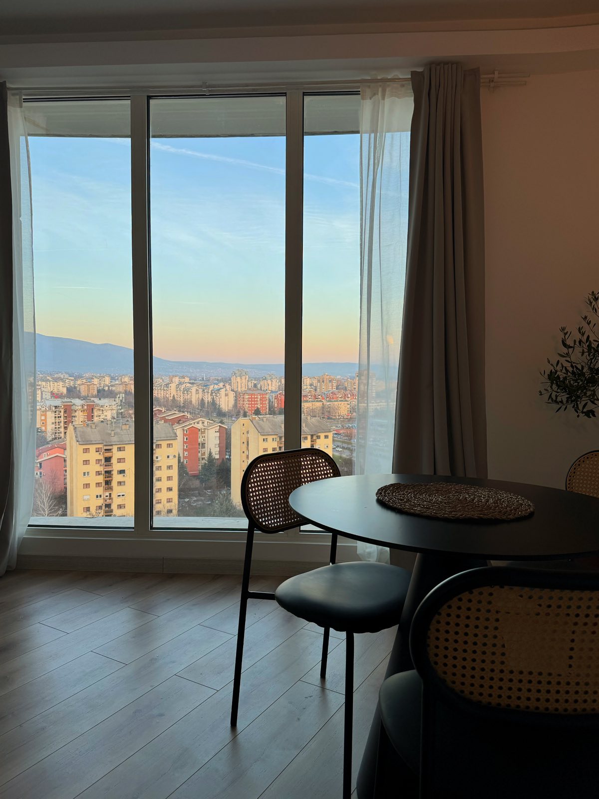 A furnished apartment with a beautiful view of the city of Skopje, and the slopes of the mountain Vodno especially the view of the stunning sunsets. The apartment have a fully equipped kitchen, bathroom, bedroom, living room and balcony with sliding glass. The apartment is located on the 17th floor in tower A with 4 elevators, swimming pool, spa, fitness center, 24/7 security, market and free parking in front of the towers. This unique place has a style all its own.