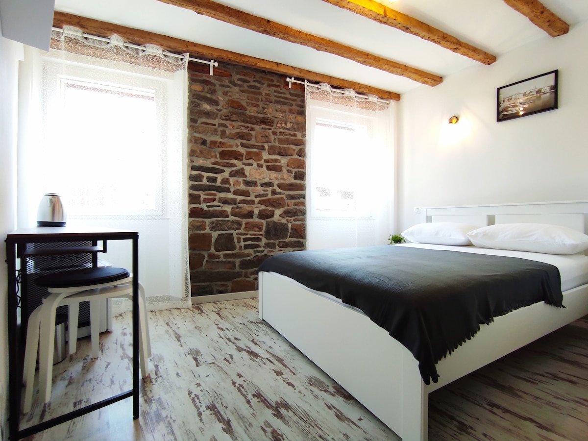 El apartamento está situado directamente junto al mar, cerca del casco antiguo. Está situado en la primera planta y consta de dos dormitorios, una cocina con zona de comedor y un baño. Los huéspedes tienen a su disposición una cocina totalmente equipada, TV vía satélite, aire acondicionado, wifi, ropa de cama y toallas. La terraza es compartida, pero cada apartamento tiene un rincón separado en ella.