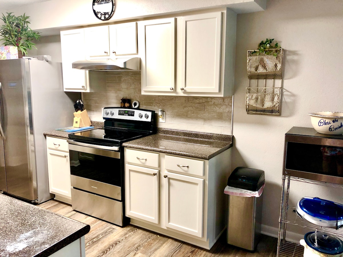 ¡Los invitados a largo plazo DAN LA BIENVENIDA! (Mensual + % de descuento semanal) ¡Disfruta de esta espaciosa casa de 1 dormitorio cerca de hospitales, tiendas y entretenimiento de Tyler! Este vibrante espacio tiene wifi rápido, una cama California King, una cocina totalmente equipada, una bañera separada + ducha y un patio privado con vistas a un patio verde en un barrio tranquilo en un barrio seguro. Esta es la unidad principal PRIVADA de un Airbnb DÚPLEX. Es decir, cero espacios compartidos, solo una pared compartida en la cocina. Lee los detalles a continuación