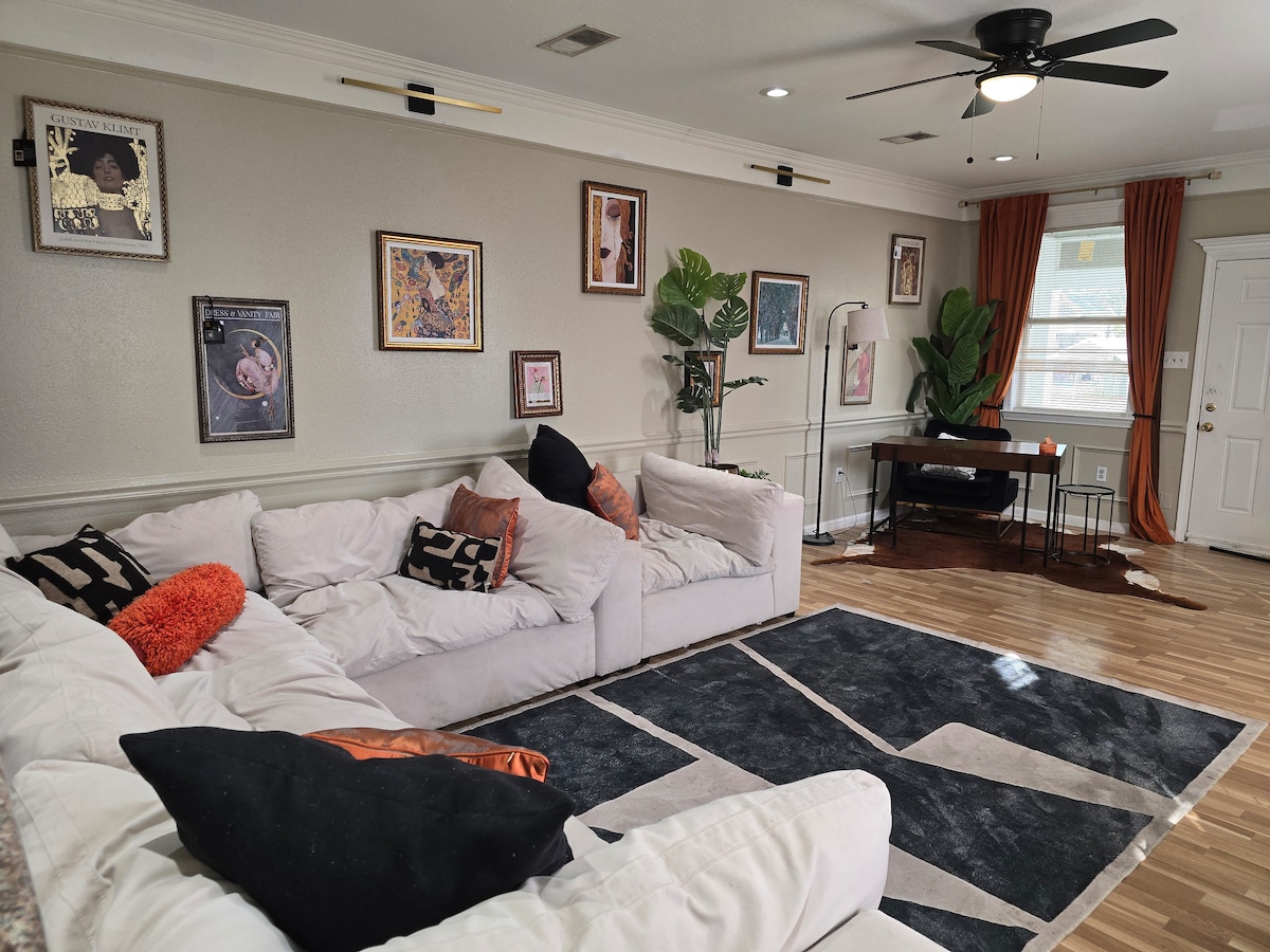El alquiler vacacional con licencia legal tiene 3 dormitorios grandes, 2 baños completos, 1 medio baño, comedor y cocina combinados. Amplio balcón en el tercer piso con vistas al distrito del jardín. Esta unidad cuenta con todas las comodidades que encontrarías en tu propio hogar, incluida una tabla de planchar con lavadora y secadora y plancha. El tranvía está a una cuadra y Magazine Street está a 3 cuadras cortas. Mucho espacio para relajarse y visitar con familiares y amigos, una gran isla en la cocina con sofá y sillas en la encimera.