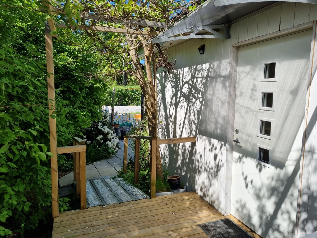 Bienvenido a nuestra casa de huéspedes ubicada en nuestro jardín. Hay una cama doble, sofá cama, comedor, cocina, nevera/congelador, microondas, aseo, ducha y lavadora. Apto para niños, con cama elástica, casita de juegos y columpios. Vivimos a 2 minutos de la estación de tren de cercanías de Häggvik, con trenes directos a Arlanda, Mall of Scandinavia, Strawberry Arena y la ciudad de Estocolmo. A poca distancia de varias tiendas de comestibles, restaurantes y farmacias. A 10 minutos a pie de la reserva natural de Järvafältet y una granja con ovejas, cerdos, vacas, cabras, pollos y caballos.