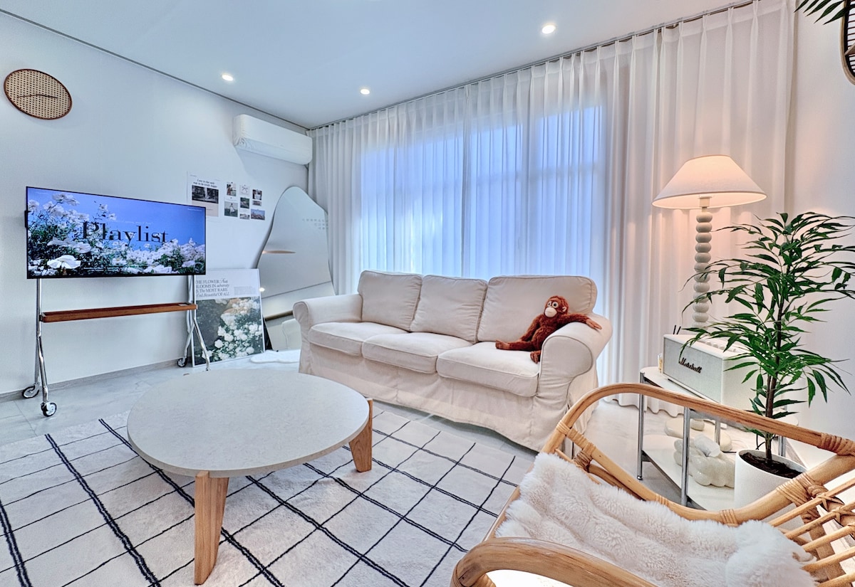 A 5 minutos a pie de la playa de Haeundae, Este es un alojamiento de 2 HABITACIONES cerca de los autobuses y subterráneos del aeropuerto. Dos dormitorios independientes, cocina y sala de estar. Familias, amigos, parejas, viajeros con niños Todos se quedan tranquilos y cómodos Este es un alojamiento donde puedes relajarte. Sol cálido que brilla todo el día El interior de nuestra pareja Accesorios emocionales, suministros de lujo. Un refugio acogedor y cálido. ✈️ A 5 minutos a pie de la parada de autobús del aeropuerto, estación de Haeundae Jungdong 🌊 Playa Haeundae · Mercado convencional Haeundae a 5 minutos a pie 🚂 A 5 minutos a pie de Blueline Park 🛍 E-Mart, Olive Young, Haeridan-gil, Dalmaji Pass a pocos pasos Solo se proporcionan suministros premium. Champú premium, productos acondicionadores. Producto de lavado de manos premium Aesop. Ropa de cama de ganso premium. ¡Las estadías largas, los viajes pequeños y los viajes de negocios son bienvenidos! • Los niños menores de 24 meses son gratis y no se proporcionan camas supletorias. Sigue las reglas del número de personas: -) • Ambos dormitorios tamaño queen están disponibles para 2 personas. Instagram @stay_3rdmind
