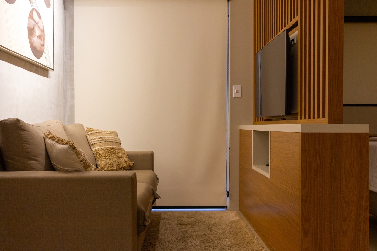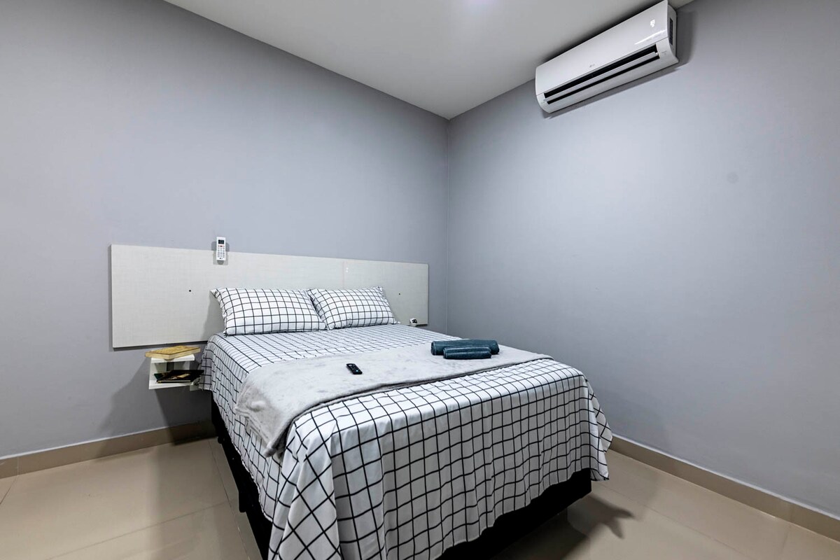 Estudio nuevo y completo. Cuenta con conserje las 24 horas, estacionamiento cubierto con seguridad las 24 horas. El estudio tiene cerradura electrónica, aire acondicionado, wifi, TV por cable, televisión inteligente, Netflix, Disney, youtube, Spotify. Cocina equipada, acogedora sala de estar, cama matrimonial, armario con estante para 2 personas, balcón gourmet. Excelente ubicación, cerca de restaurantes, supermercados y centros comerciales. El edificio tiene un mini mercado y un espacio privado para mascotas. ¡Ideal para noches cortas o largas!