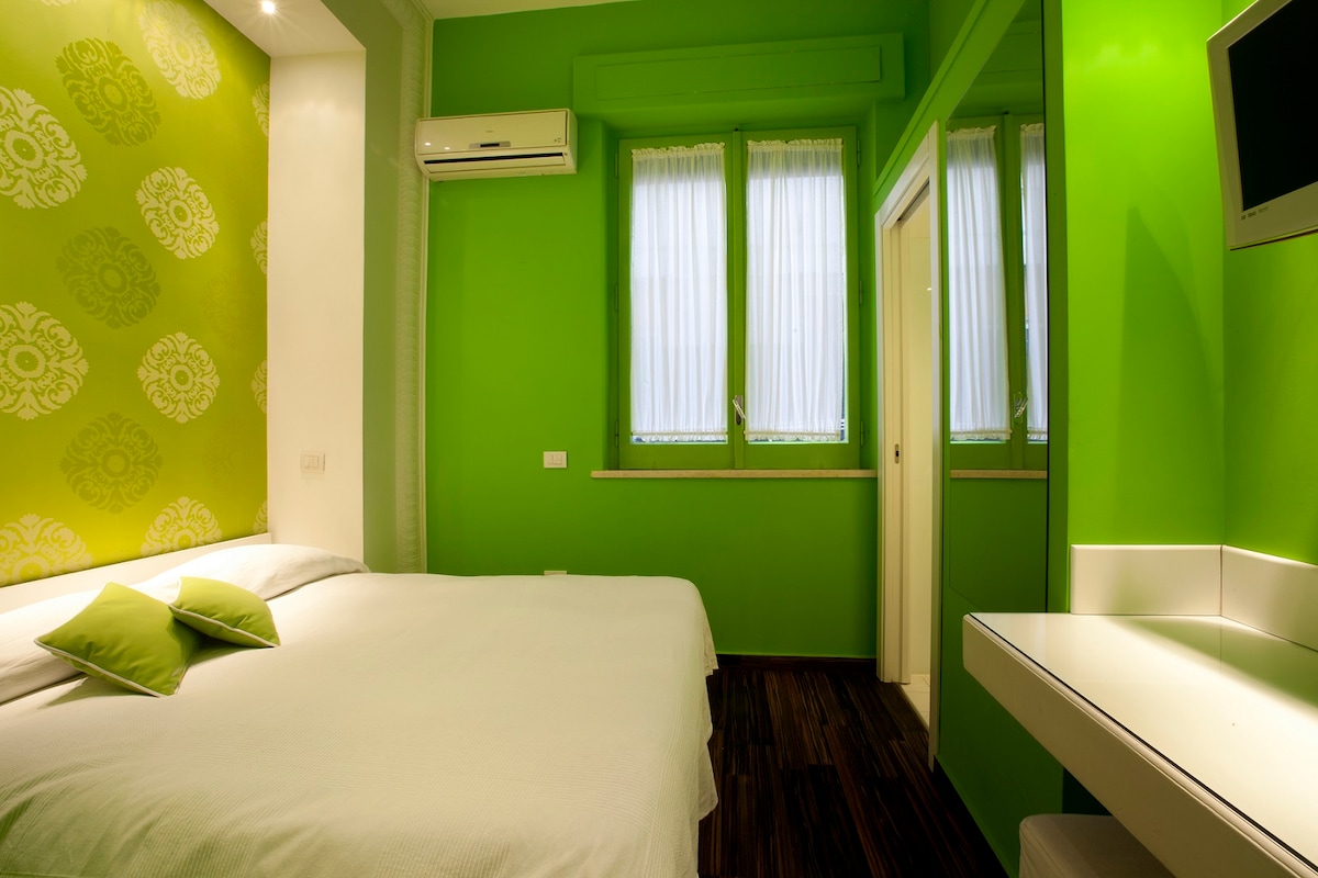 Habitación espaciosa con muebles luminosos y funcionales. La habitación dispone de todos los accesorios modernos, entre ellos: • Kit de bienvenida • Cambio de sábanas • Nevera • Aire acondicionado • Calefacción • TV • Caja fuerte • Wifi • Baño con ducha y cromoterapia • Secador de pelo • Hervidor eléctrico con infusiones siempre a tu disposición • Cafetera con cápsulas