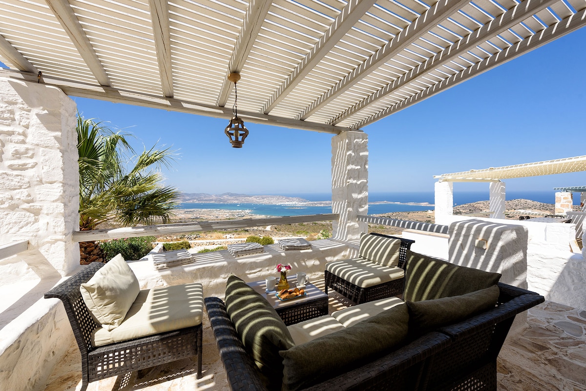 Sarris Luxury Blue Horizon 2 es una casa de nueva construcción situada en el borde de una exuberante granja con vistas al Egeo y las islas circundantes. Blue Horizon ofrece una de las vistas más magníficas del mar y del atardecer en Paros. A minutos de la playa prístina de Aghia Irene y de la playa de Pounta, ideal para practicar kitesurf. Una ubicación verdaderamente perfecta para relajarse con familiares y amigos. ¡Disfruta de una copa de vino casero Sarris mientras contemplas espectaculares puestas de sol!