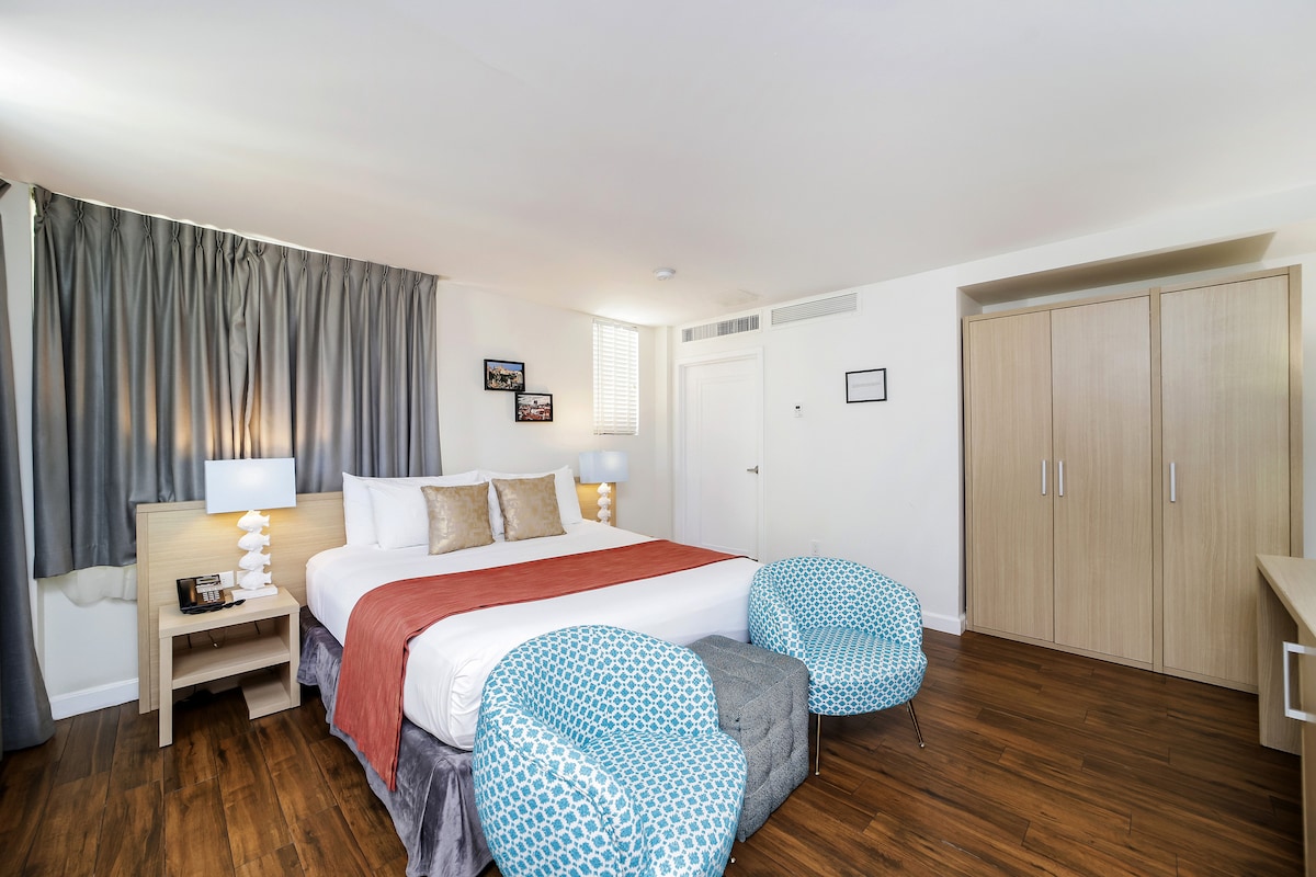 Disfruta del lujo refinado en esta suite recién renovada de South Beach, a solo una cuadra del océano. Perfecto para el ocio o los negocios, cuenta con una lujosa cama tamaño king (o dos camas individuales a pedido), wifi de alta velocidad, televisor inteligente y un espacio de trabajo dedicado. Los detalles incluyen un armario con colgadores, plancha y tabla de planchar. Hay estacionamiento cerrado seguro disponible cerca por $20 por día, que ofrece estilo, comodidad y conveniencia en el corazón de South Beach.