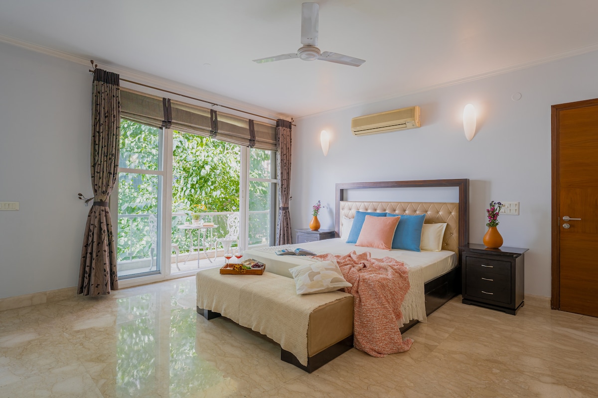 Stay at our spacious 2BR Park-View Retreat, 8.5 km from airports & 15 min ride to the metro. Enjoy airy balconies, park views, mahogany/wooden beds, a fully-equipped kitchen, high-speed Wi-Fi, Smart TV, complimentary toiletries, & local recommendations. Relish home-cooked meals, explore nearby market & malls, and unwind with serene jogging paths. Experience top-notch hospitality with flexible check-in/out, laundry services & optional airport transfers. Book now for a memorable Delhi stay!