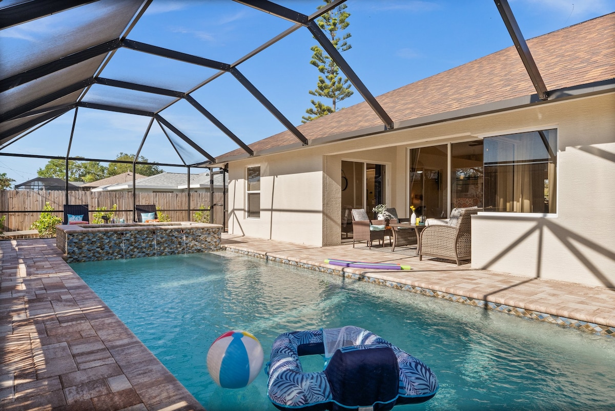 Casa con piscina para familias con planta abierta. Cocina nueva con electrodomésticos de acero inoxidable y barra de desayuno. La sala de estar tiene un sofá cama con colchón de espuma viscoelástica mejorado. Gran solárium con vistas a la piscina privada totalmente protegida y patio trasero tropical vallado. Muchas comodidades: lavadora y secadora, flotadores de piscina, tumbonas, sombrilla, toallas y juguetes de playa, neveras. A 7 minutos en coche de la playa de Manasota, a 5 minutos de restaurantes, tiendas, etc. El principal tiene baño privado y vestidor. ¡Cuna portátil, juguetes y juegos!