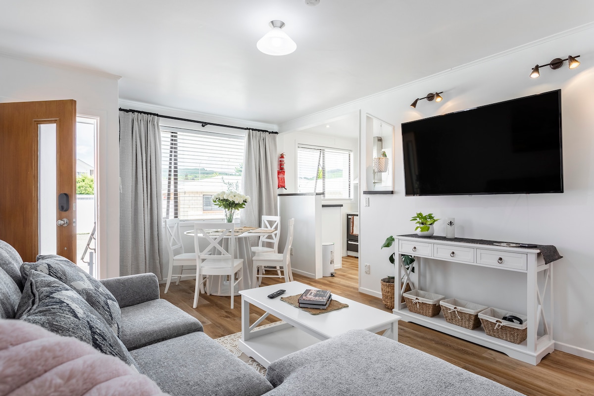 Aero en Massey está a pocos pasos del centro de Greytown. Este moderno apartamento de un dormitorio, elegantemente presentado, está totalmente vallado y unido a la casa de los propietarios, pero tiene acceso privado. Los servicios incluyen: wifi, Smart TV, cocina americana, mininevera, terraza y jardín. El dormitorio tiene una cómoda cama tamaño queen y un sofá cama para un huésped adicional. Se admiten niños. Aero admite mascotas pequeñas. El acceso de los huéspedes a su lado de la propiedad está a la vuelta de la esquina en Massey St.