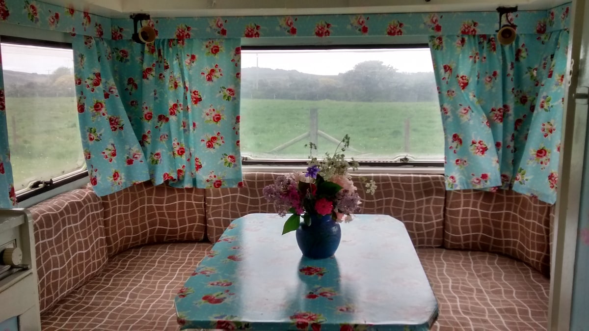 Wonderful setting-cheap+very cheerful lone caravan with a woodstove in a very small field-with views of the Preseli Hills+great walks! She is an old lady of a van, with much charm! Sleeping 2 adults in lounge area bed+2 children in narrow bunkbeds+she is the only caravan here-in a glorious setting, by the moor+mountains+stonecircle. We supply bedding for the double bed+we ask you to please bring your own bedding for the childrens bunk beds. Thank you!