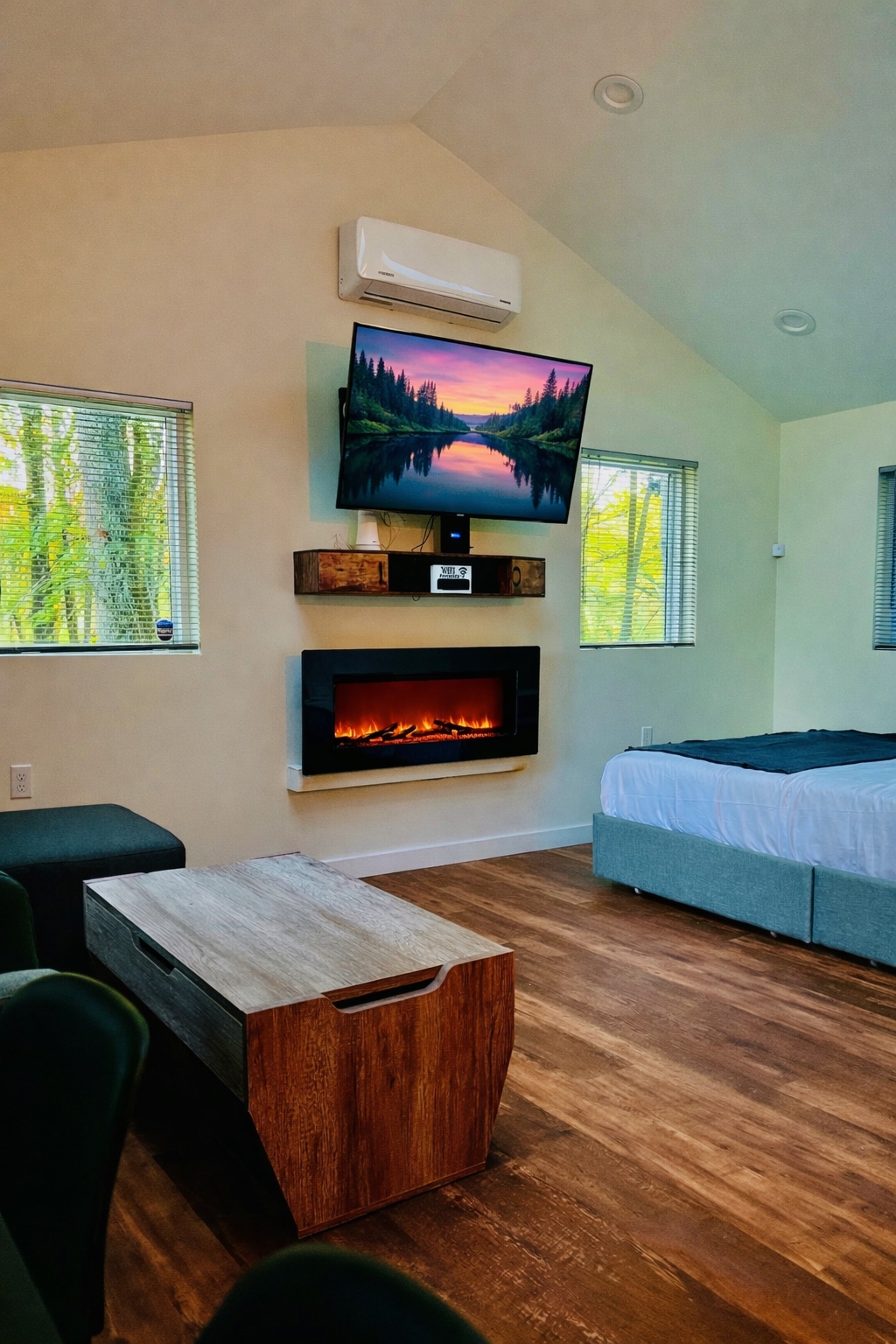 El arroyo fluye a través de un bosque perenne creando un ambiente nutritivo y el escenario perfecto para un relajante y rejuvenecedor retiro de spa. La sala de estar/comedor, la bañera de hidromasaje/terraza y la chimenea de gas están situadas con vistas al arroyo en cascada, ideal para entretenerse, meditar o simplemente como una agradable musa natural. El interior suave, acogedor y elegantemente vintage está iluminado y calentado con calefacción central, iluminación ambiental y un sistema de entretenimiento de sonido envolvente con karaoke.
