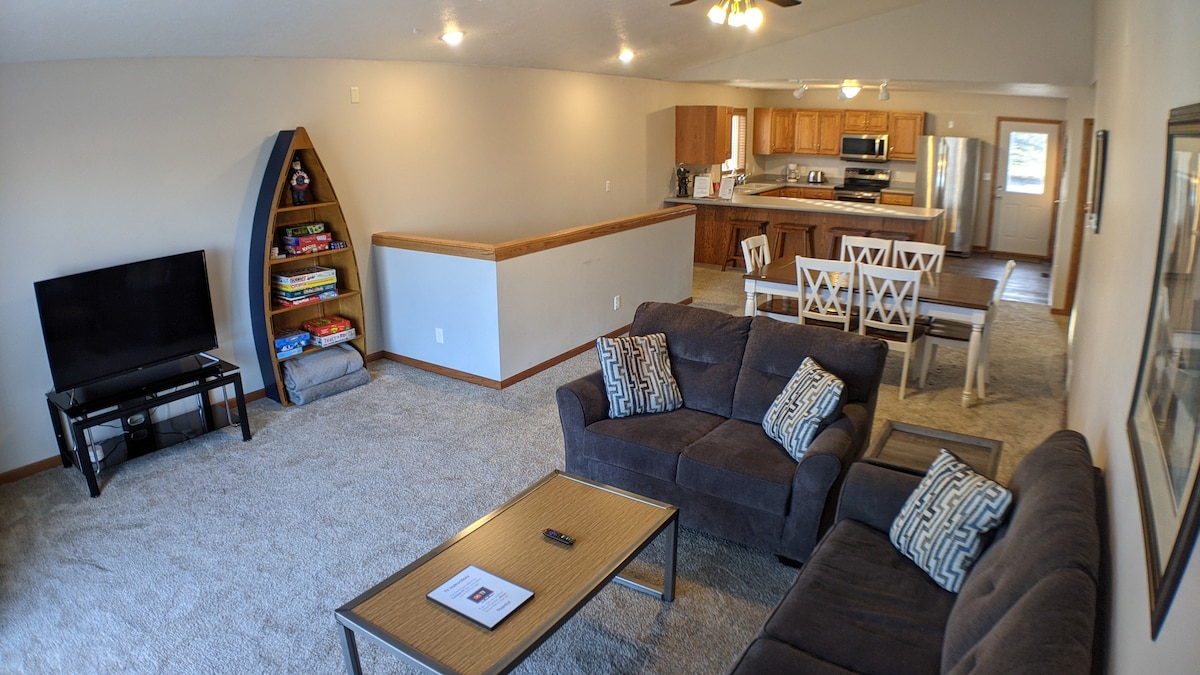Impresionante cabaña en Bridges Bay Resort ubicada en el estanque de pesca. 2 dormitorios cerrados más loft. El garaje, muy bien acabado, ofrece espacio adicional para pasar el rato. Se proporcionan 2 kayaks para su uso en el estanque. Incluye 6 pases diarios al parque acuático, a poca distancia a pie de los restaurantes de Bridges Bay y del acceso al lago. Patio de gran tamaño con parrilla de gas Weber. Entrada ampliada para un máximo de 4 coches (no se permite el estacionamiento en la calle). Lavadora/secadora disponible en la unidad para uso de los huéspedes. El huésped que reserve debe ser mayor de 25 años, no se permiten fiestas.