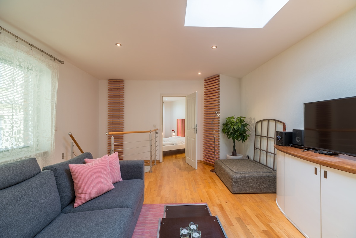 El alojamiento ideal para noches tranquilas en el campo y se pueden encontrar conexiones de transporte ideales en el loft del sótano de nuestra acogedora villa familiar. Una cocina americana totalmente equipada, una ducha de lluvia abierta y el espacio de estacionamiento frente a la puerta ofrecen todas las comodidades modernas. Las líneas S-Bahn S1 y S7, que están a pocos pasos, tienen excelentes conexiones de transporte a la feria comercial (15 minutos), al oeste de la ciudad (20 minutos) y al este (30 minutos), a Potsdam (15 minutos) y a todo el transporte público día/noche.