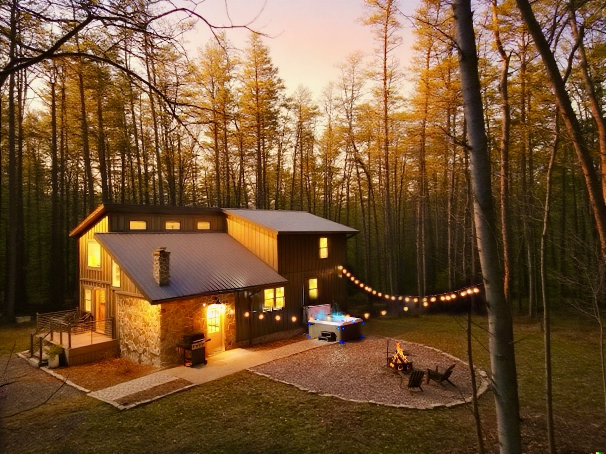 Escape to this unique round tiny home by a beautiful private lake, located on 350 private acres. Perfect for a cozy getaway, it offers a full kitchen, bathroom, and a serene bedroom with a large round skylight located directly above the queen-sized bed! Unwind in the Jacuzzi hot tub, enjoy the fire pit, or relax by the water. It is ideal for those seeking peace and nature, with kayaking and fishing right outside your door. Experience tranquility in this one-of-a-kind retreat!