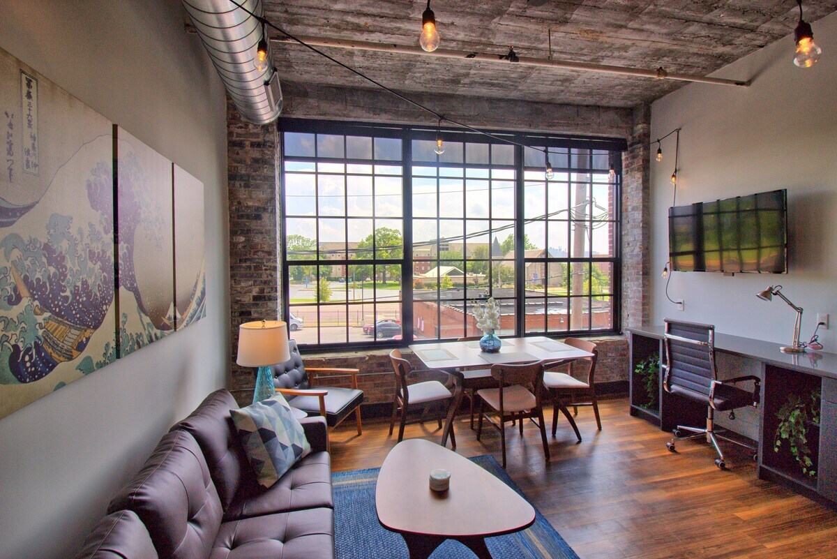 El Nash Loft es un precioso loft tipo estudio con techos de 12', una cocina totalmente equipada con electrodomésticos de acero inoxidable negro y encimeras de cuarzo, lavadora y secadora apilables, un baño de diseño con accesorios de acero inoxidable negro y ducha de vidrio sin marco, un cómodo espacio de trabajo con conexión a Internet de alta velocidad y un patio comunitario iluminado por Edison. Situado a lo largo de la famosa Locust Street en el corazón de Midtown, estarás a pocos pasos de SLU, Wells Fargo, BJC y The Grove.