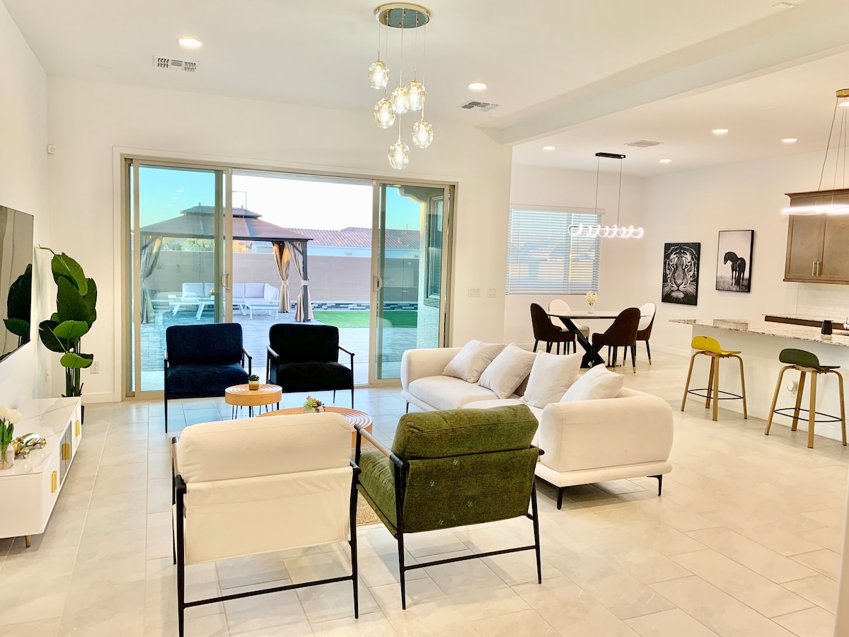 Welcome to the Handcrafted Home in the desert. There is a large outdoor area with a heated pool, bbq, and propane fire table. The heating of the pool is included in the cost of your stay from October-May. You will enjoy entertaining in the fully equipped chef’s kitchen with updated appliances and an air fryer in the oven. The comfy beds are memory foam and the bathrooms are both updated. Skip the game day/concert traffic and opt for an easy walk. We are located 0.8 miles from State Farm Stadium.