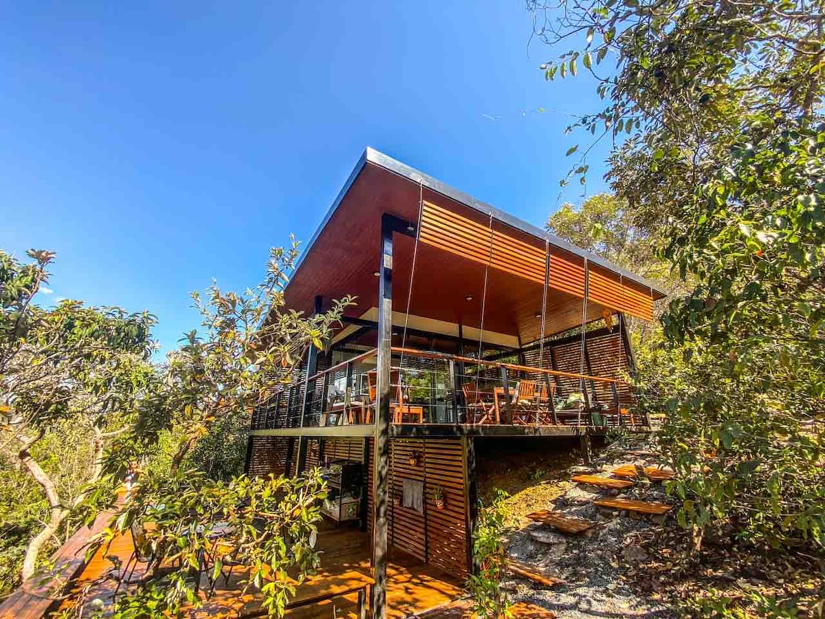 La casa está ubicada dentro de un condominio cerrado en medio del cerrado con vistas a la Serra de Santana, ubicada en el Parque Nacional Chapada dos Veadeiros. A solo 3,5 km del centro de Cavalcante y cerca de varias cascadas. De nueva construcción, la casa tiene su diseño basado en madera, vidrio y acero y fue diseñada para privilegiar la vista del paisaje, el amanecer y la puesta de sol. Por cierto, la espectacular vista de la Serra en toda la casa hace que la estancia sea una experiencia única.