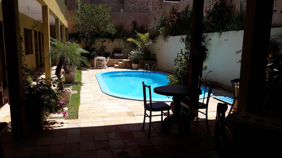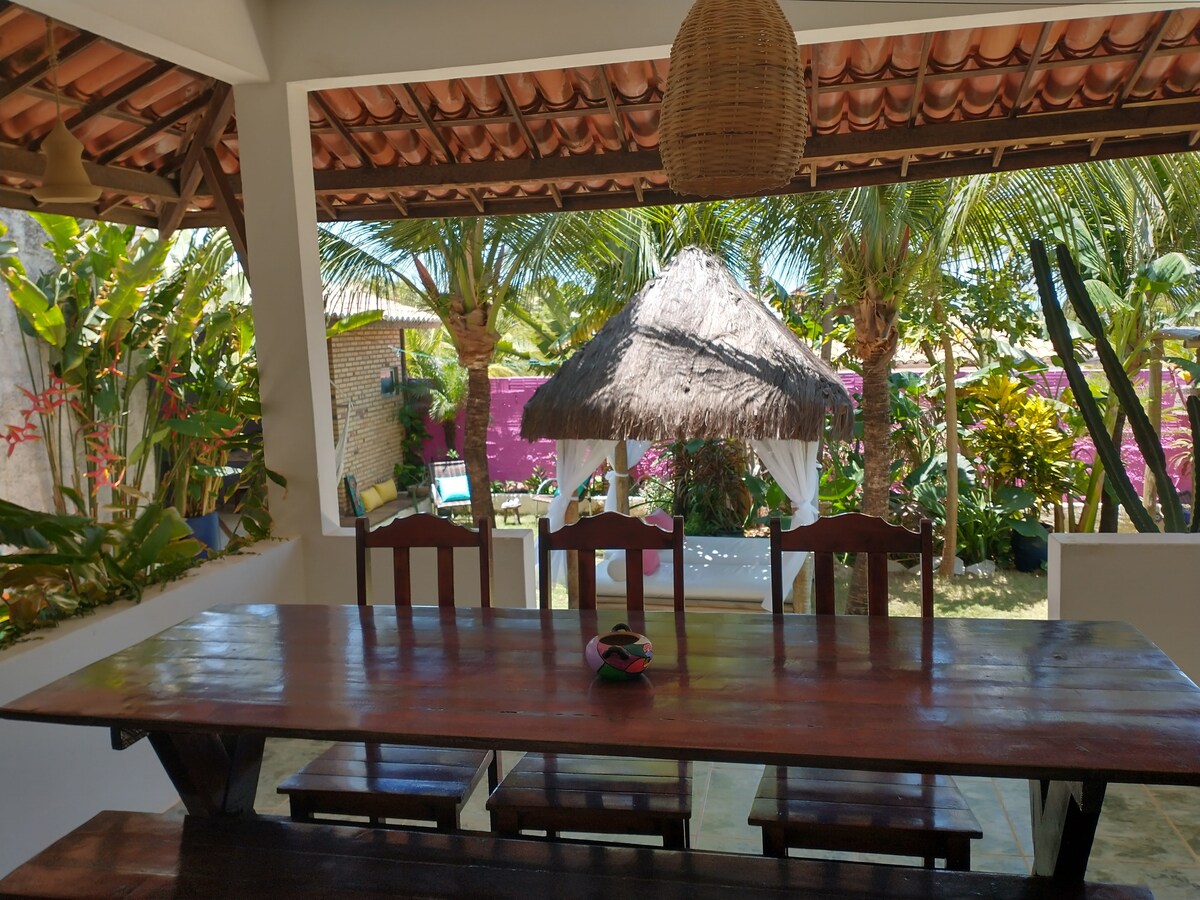 Apartamento en la planta baja de nuestra Posada Vila Beija-flor, para hasta 5 personas con cocina nueva y completa. Vistas para el mar y dunas. Cuarto con cama de matrimonio y otra de soltero y dos camas en la sala. TV plana 21", Netflix, ventiladores, caja de seguridad, ducha caliente, wi fi, hamaca en la terraza. Comedor frente al jardin con vistas hacia el mar.