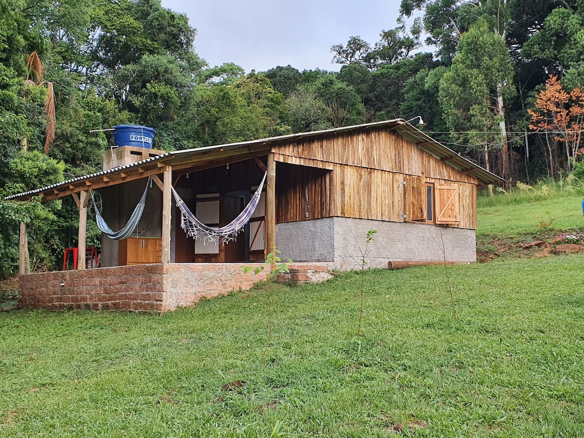 Estamos à 4,3 Km (7min) do centro da cidade. Localizada no sitio junto a nossa casa na Linha Ávila Alta 2090, percurso todo asfaltado. A casa é construída artesanalmente, com teto verde e amplo jardin. Acomoda 4 pessoas, 2 adultos e 2 crianças,1 quarto (cama de casal e sofá cama), 1 banheiro, cozinha equipada com frigobar, fogão, microondas, cafeteira elétrica, grill e utensilhos. Roupas de cama e banho também são disponibilizadas, além de conectividade WI-FI.