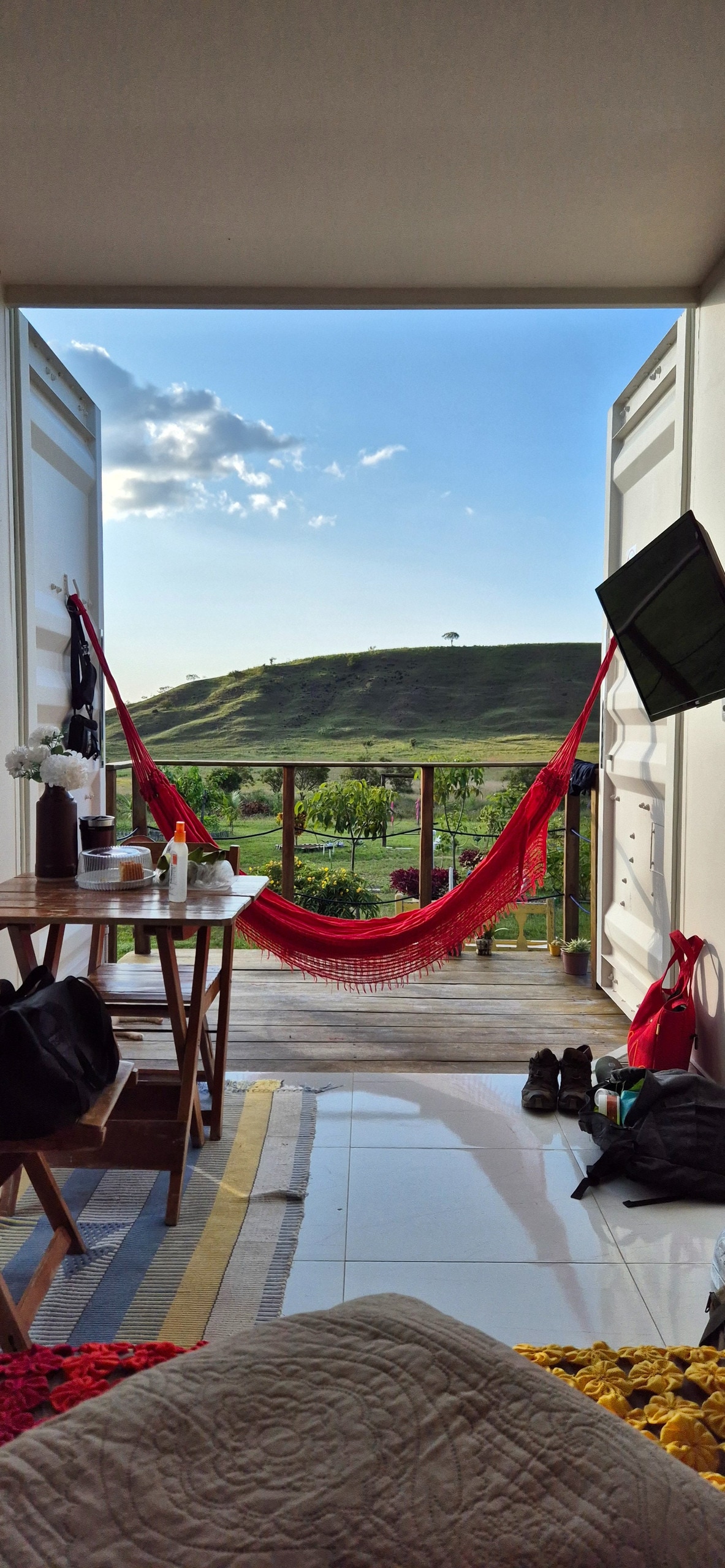 A Suíte Mão de Deus é um refúgio em meio à natureza da Serra. Um container acolhedor, com varanda, rede e vista aberta para as paisagens que convidam à pausa e à contemplação. Ideal para quem busca silêncio, conforto e conexão com o essencial. A experiência é conduzida com cuidado e hospitalidade pela anfitriã Hilda Garcez.