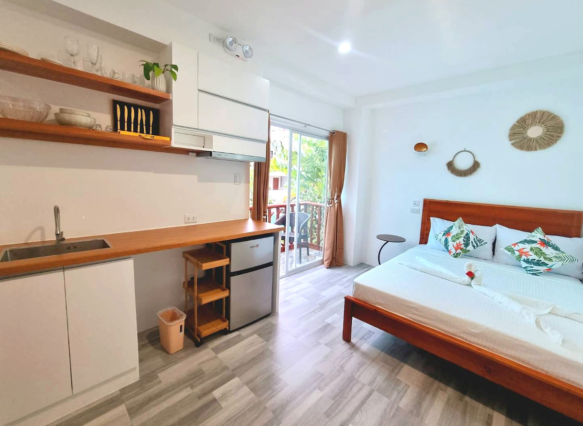 We are located at Station 1, only 1 min walk to beachfront/Starbucks, 5 min walk to Station 2 D'mall, Many restaurants/bars/stores are nearby, convenient location but super quiet area. Our building is named CiNta Hotel, a lovely small hotel, newly opened in 2024. Total 2 story 5 rooms. 3rd floor is rooftop a small restaurant & bar. This room is at 2nd floor, it's suite type with balcony and kitchen, including rice cooker, electricity stove, Pan, kettle, plates, cups, basic cooking equipment.