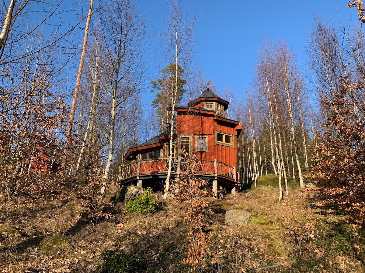 Alójate con el estándar del hotel en el bosque sin electricidad. Cocina sobre una chimenea abierta y disfruta del cielo estrellado a través de grandes secciones de vidrio en una cómoda cama doble. Una experiencia forestal fuera de lo común en medio de Halland, cerca tanto del mar como del lago. Además de alguna oveja de vez en cuando, está completamente solo en una pequeña arboleda. Desde la sauna hay una hermosa vista de la guarida. El desayuno con productos locales se recoge en la granja. El precio es para 1–4 personas e incluye desayuno, sauna, ropa de cama, limpieza y leña.