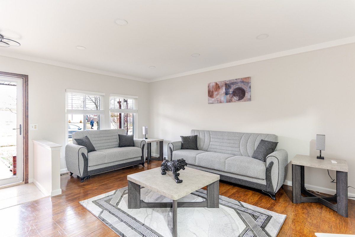 Sala de estar🌞 llena de sol: relájate en un espacio acogedor y bien iluminado con una decoración moderna y TV inteligente. Cocina 🍳 totalmente equipada: ideal para estancias largas, con todo lo necesario para cocinar como en casa. Ubicación 📍 privilegiada: a minutos del centro de Ferndale, Royal Oak, las atracciones de Detroit y los restaurantes locales. Wifi 📶 rápido y espacio de trabajo: mantente conectado para trabajar o ver contenido en streaming. 🏡 Comodidad para todos: perfecto para familias, viajeros de negocios y escapadas de fin de semana.