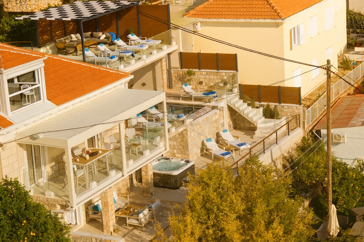 Villa Antoan boasts 630m2 of undeniable luxury and elegance,featuring 5 bedrooms with full en suite bathrooms,each with a private balcony. Modern and luxurious interior details of Villa Antoan create a fully equipped kitchen that merges with a spacious living room and dining area, all having an open sea view, perfect for gatherings. The terrace, adorned with a heated infinity pool, summer kitchen with outdoor dining area adds an extra layer of charm, making it ideal spot for ultimate relaxation.