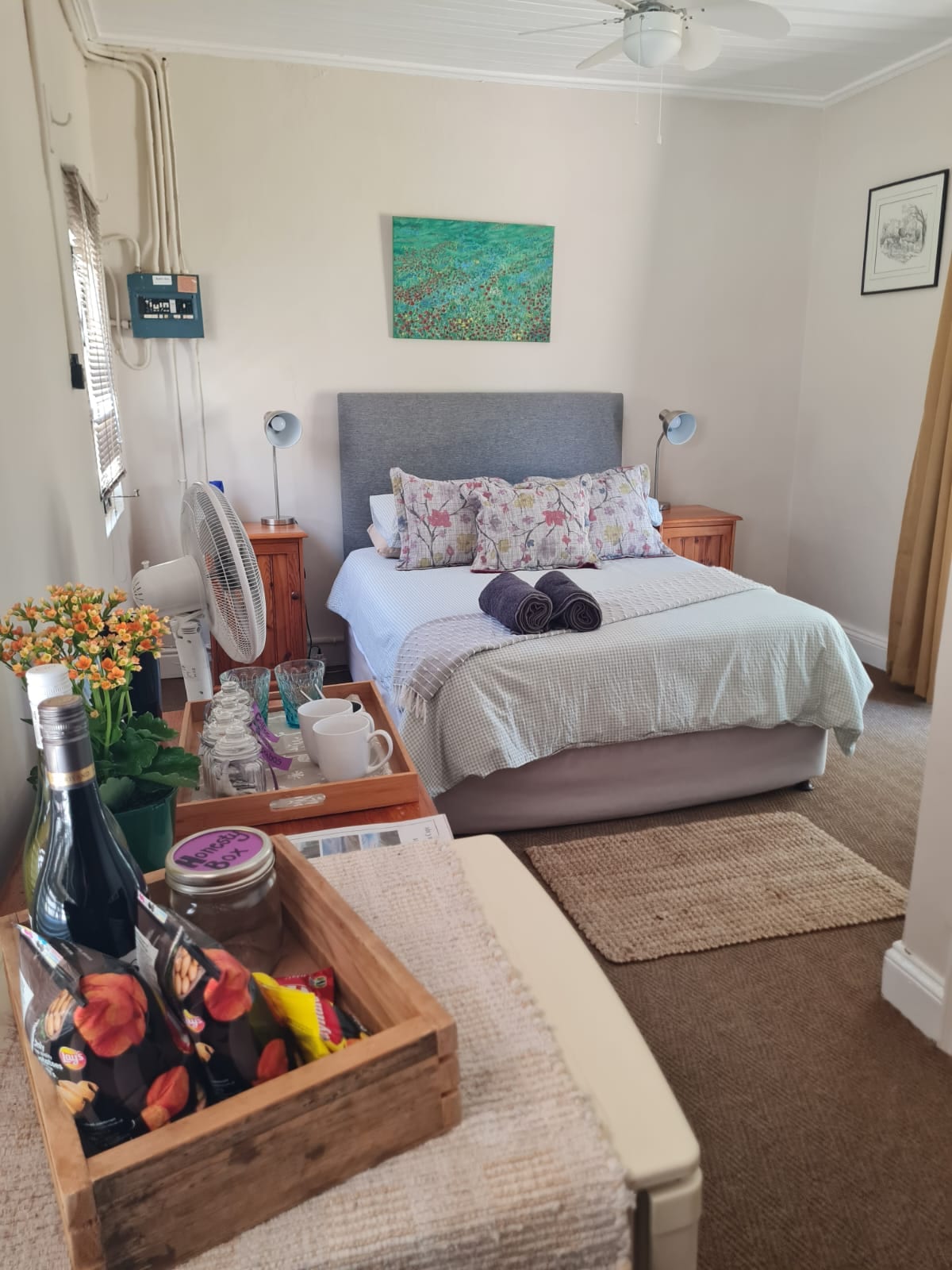 Overnight at our quaint accommodation with its own private entrance in Graaff-Reinet. Close to restaurants and a grocery store in a quiet part of town. Complete with little touches to make your stay feel like home. We provide handmade soap, homemade rusks, tea and coffee (even sherry!). Relax on the stoep which is parallel to the secure, and private, behind-a-gate parking (with space for a trailer too) right at the stairs of the stoep of your accommodation. *Kindly note, there isn't a TV*