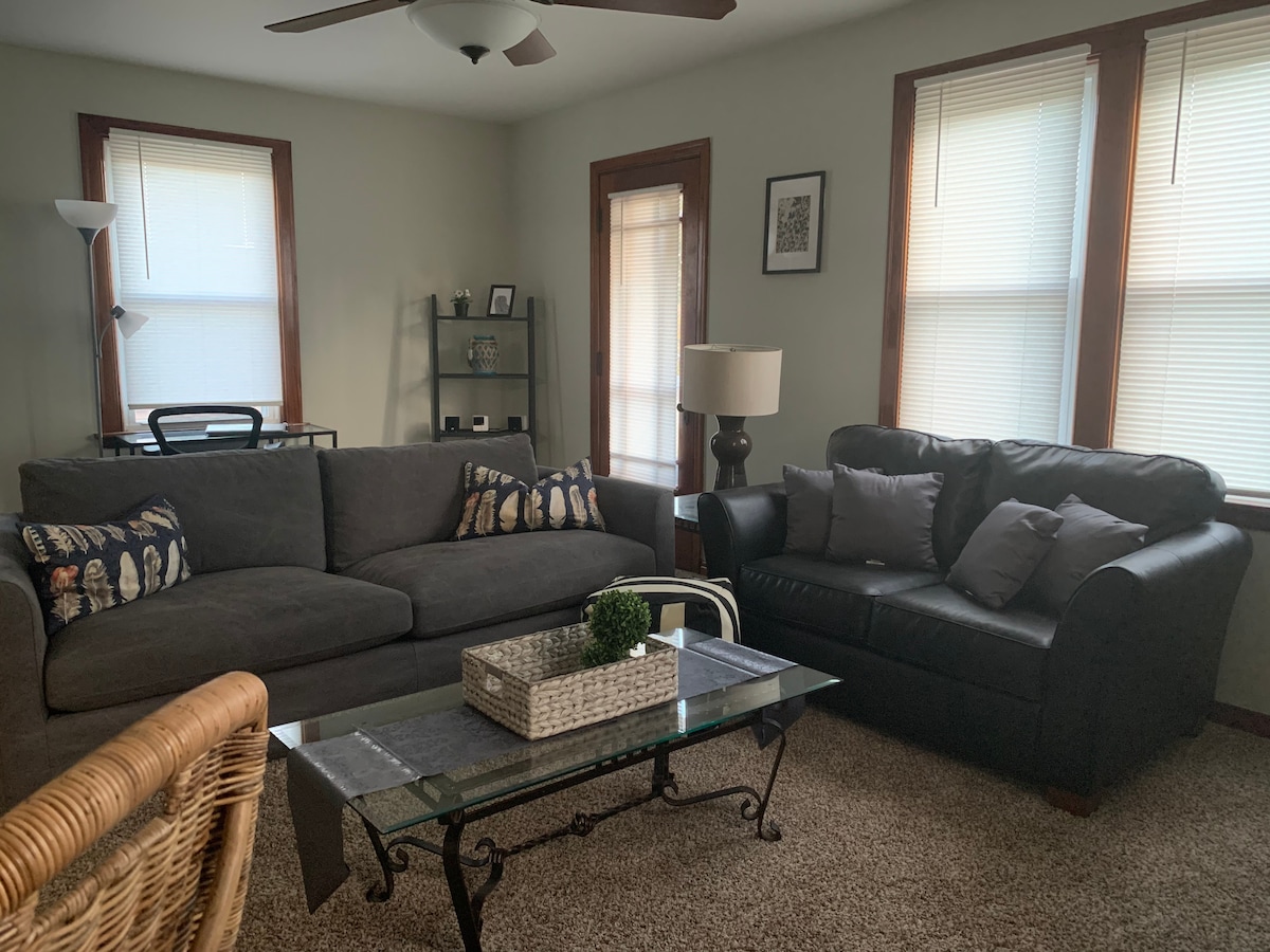 Nuevo apartamento tipo estudio totalmente amueblado en el segundo piso en un tranquilo vecindario de primer nivel. Entrada privada con llave a la escalera interior. Aproximadamente 800 pies cuadrados. Pisos de madera, gran habitación, ventanas muy grandes, mucha luz. Plano de planta con cocina completa y zona de estar, sala de estar con sofá, sillas y otomanas. La sección para dormir incluye una cama tamaño queen adyacente a un baño de 3/4. Wifi, puertos de carga USB junto a la cama y lámpara de escritorio. TV de pantalla plana HD de 32 pulgadas de fibra óptica de 164 canales montada en la pared con ROKU, deportes, canales premium.