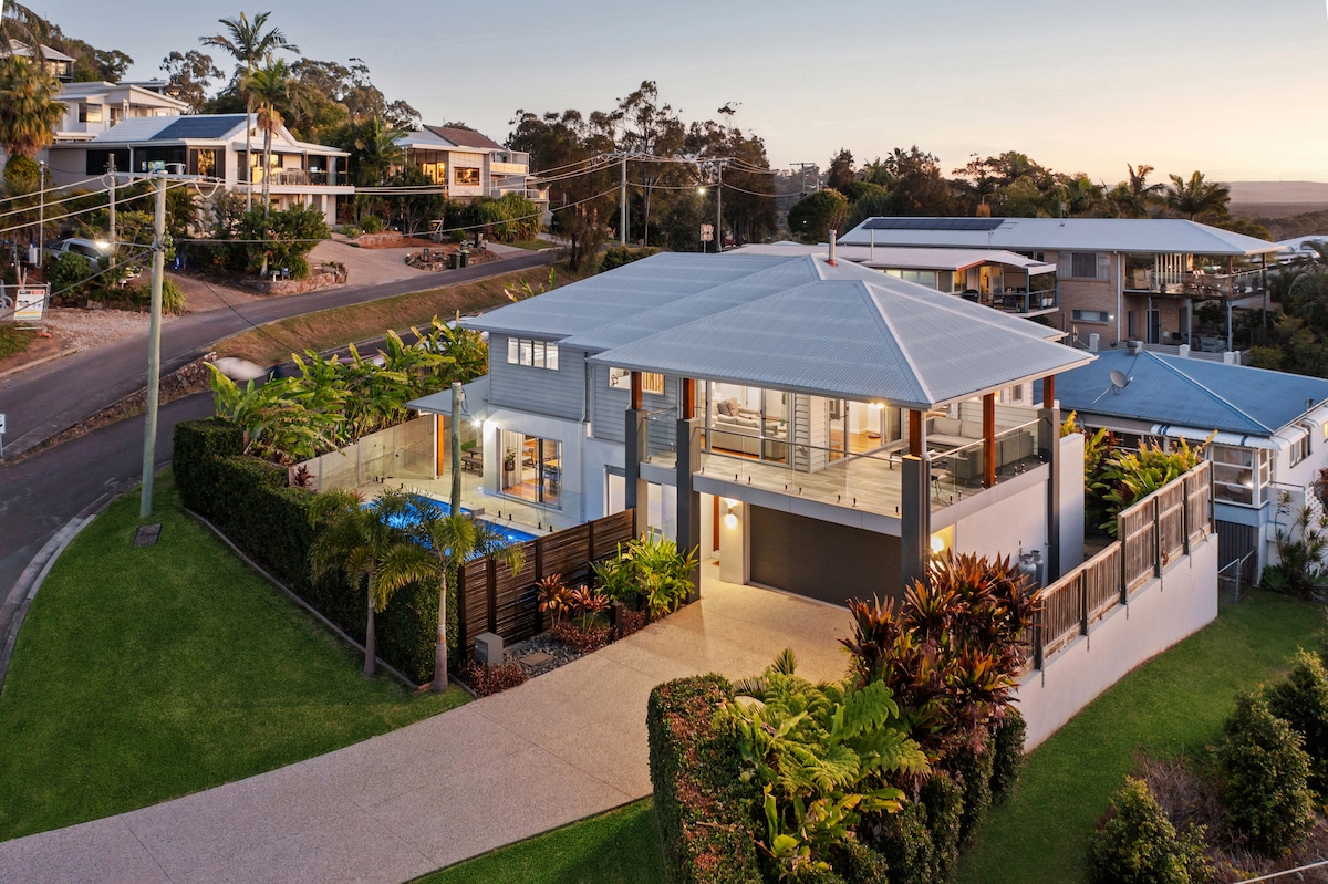 Ubicada a 350 metros de la playa, esta casa de 5 dormitorios bellamente decorada ofrece vistas al mar, vida de planta abierta y múltiples espacios al aire libre y al aire libre, todo envuelto en una exuberante vegetación con vistas a la montaña Cooroy. Con una configuración doble, piscina privada y spa, y servicios aptos para mascotas, es la base perfecta para familias o grupos que buscan una escapada junto a la playa a pocos minutos del bullicio de Hastings Street. Esta es la casa de vacaciones multigeneracional perfecta.