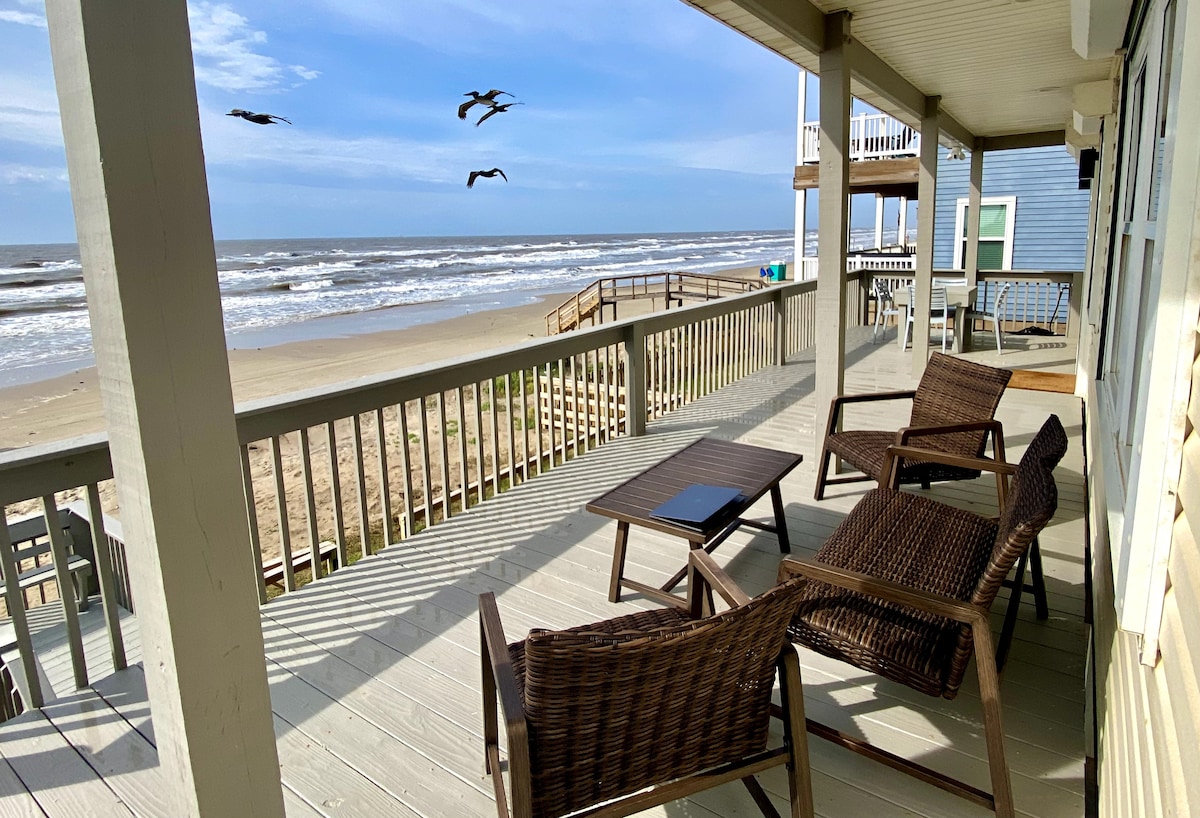 ¡NUEVA construcción frente a la playa! ¡Verdaderamente un unicornio:🦄 UBICACIÓN, LUJO y tan agradable tenerlo NUEVO! ¡Ubicado a pocos pasos de los mejores restaurantes y playa en Surfside! Disfruta de hamacas y juegos debajo de la casa. ¡Sube los escalones hasta una impresionante terraza sombreada con vistas desde San Luis Pass hasta el embarcadero! Vistas despejadas de 180 grados. Dormitorios abiertos a SunDeck y observación de estrellas con 🔥 fogata YouTube Beachfront Luxe para video ¡Tarifa de limpieza de $ 125 y solo $ 75 en total para un máximo de 2 mascotas para toda la estancia!