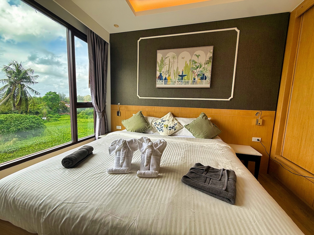 La mejor vista al atardecer al atardecer en la azotea, piscina y cocina, bañera, balcón, 1 dormitorio, 1 sala de estar, habitación acogedora y seguridad las 24 horas.