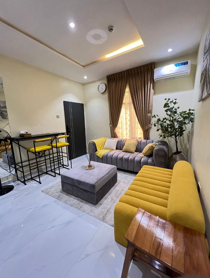 Tu elegante alojamiento es un departamento seguro de 3 dormitorios en Isolo, a solo 15 minutos del aeropuerto. El dormitorio principal tiene una cama ortopédica tamaño king, balcón, salón y espacio de trabajo. Todas las habitaciones tienen baño privado, aire acondicionado y televisor inteligente. Electricidad de banda A las 24 horas del día, los 7 días de la semana (solar + 2 generadores de respaldo), wifi rápido ilimitado, DSTV (más de 105 canales, paquete Confam), seguridad y circuito cerrado de televisión las 24 horas del día, los 7 días de la semana y entrada privada. Perfecto para familias, grupos, negocios o huéspedes de larga estancia. Nuestro objetivo es ofrecer una verdadera experiencia de 5 estrellas.