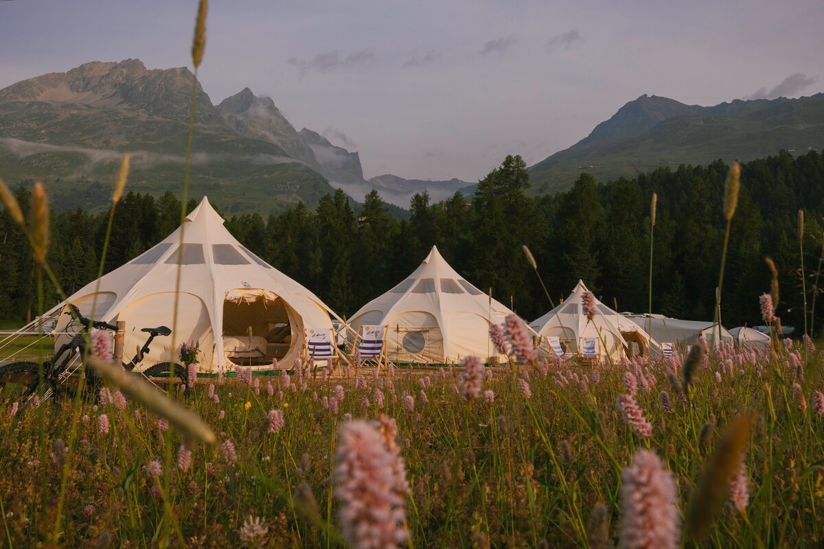 Una experiencia alpina a 1822 metros sobre el nivel del mar. Estas tiendas de campaña con estrellas se encuentran en los Alpes de Engadin, a 20 minutos a pie del mundialmente famoso St. Moritz. Este alojamiento especial está cerca del bosque, tiene un lago de baño natural en las inmediaciones y está directamente adyacente al teleférico más grande de la ciudad.