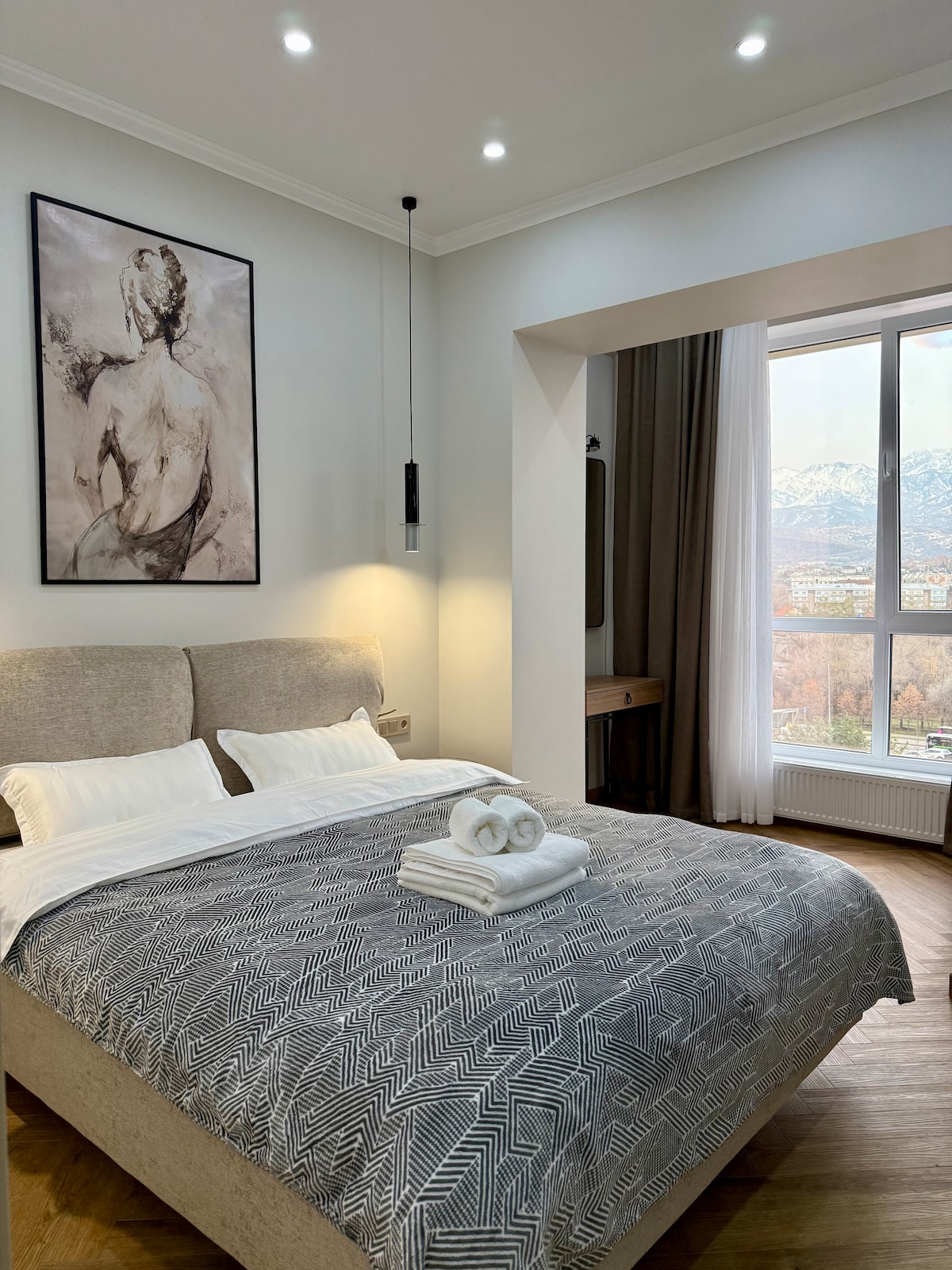 This brand-new apartment is designed for those who value style and comfort. The main highlight is the stunning mountain view you can enjoy right from the apartment. The apartment is equipped with everything you need for a comfortable stay: quality furniture, new appliances, a fully equipped kitchen, and spotless cleanliness. The neighborhood is quiet and safe, with shops, cafés, and convenient transport links nearby. It’s an ideal place to feel at home — but with the best view in the city.