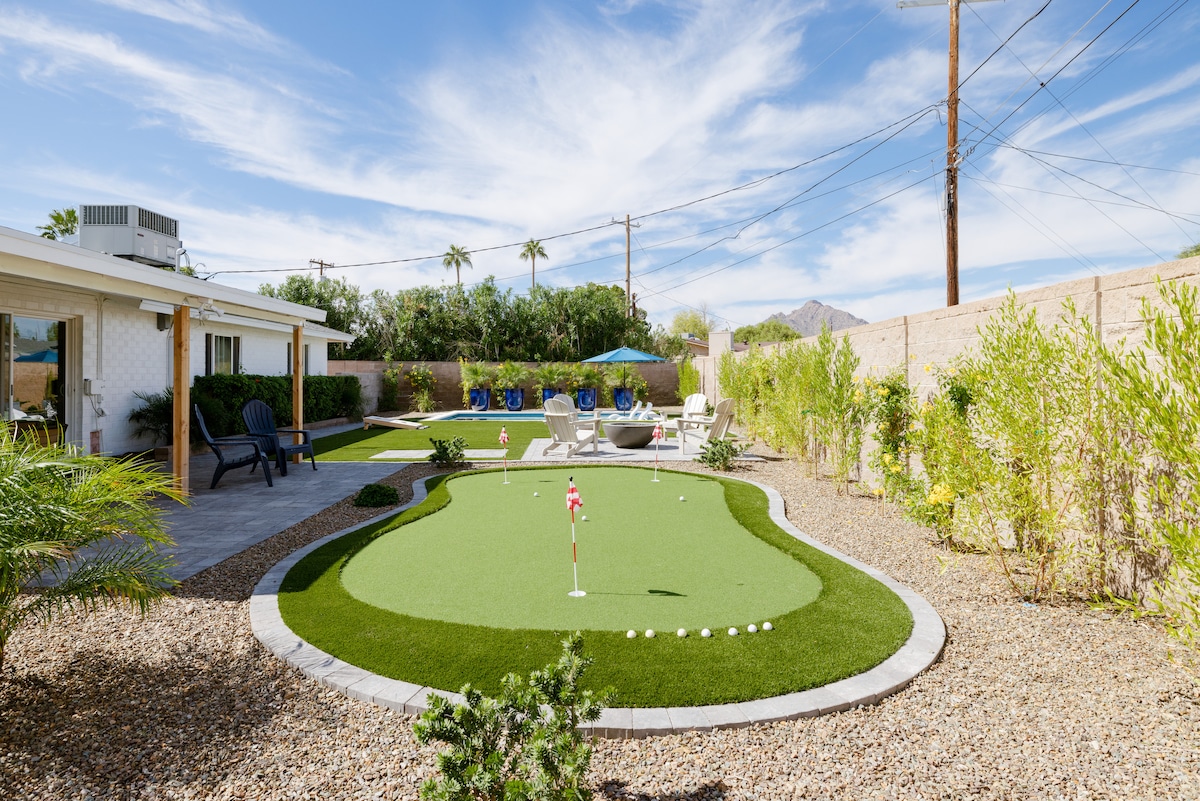 Welcome to The Hidden Hacienda Scottsdale! A fun, whimsical retreat with cowboy-chic decor, pool, spa, karaoke, and games—perfect for bachelorettes, families, or golf getaways. Sleeps 10 with comfy beds, smart TVs, a pool table and a fully stocked kitchen. Lounge beneath swaying palm trees, practice your swing on the mini putting green, or unwind in your private backyard oasis with cozy seating fire-pit and outdoor tv. Minutes to Kierland Commons, top golf courses, Spring Training and more!