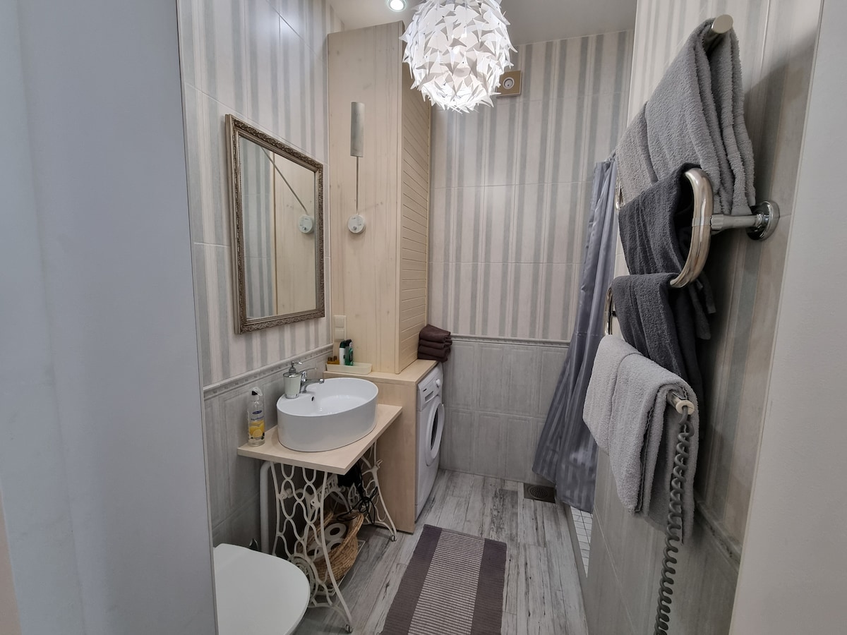 El alojamiento está situado en pleno centro. Todos los huéspedes apreciarán la proximidad a los lugares de interés. El casco antiguo y el centro de negocios están a poca distancia. Cómoda conexión de transporte. Cerca de los apartamentos hay aparcamientos urbanos de pago. Está estrictamente prohibido fumar en los apartamentos. Las fiestas están estrictamente prohibidas. En caso de incumplimiento, se aplicarán sanciones. No se admiten animales. Alojamiento. 2 dormitorios separados, cocina, sala de estar, baño, La cocina está totalmente equipada con vajilla y electrodomésticos.