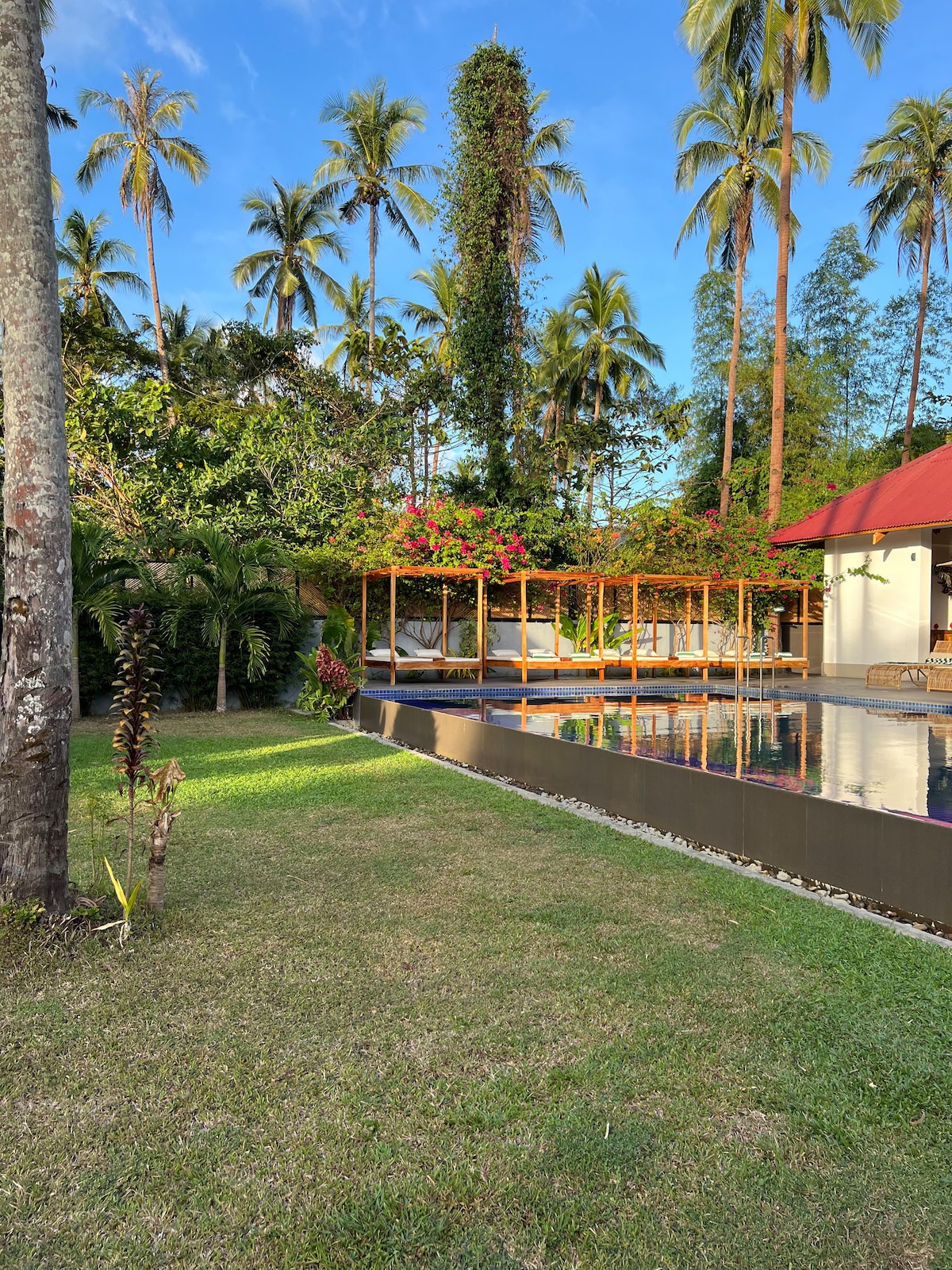 En un barrio filipino, a poca distancia en coche de la ciudad de El Nido y de la playa de Lio, esta villa con 2 dormitorios y piscina te alojará cómodamente en un ambiente moderno. Descubre especies endémicas desde el jardín con vistas al dosel, disfruta de la piscina privada, nuestra terraza doble con barbacoa y todas las comodidades de la casa totalmente alimentadas por energía solar. No se pasa por alto, la propiedad está vallada para tu privacidad y seguridad. Las motocicletas se pueden estacionar en el interior, pero el acceso por carretera de tierra de 100 metros es demasiado estrecho para los coches.