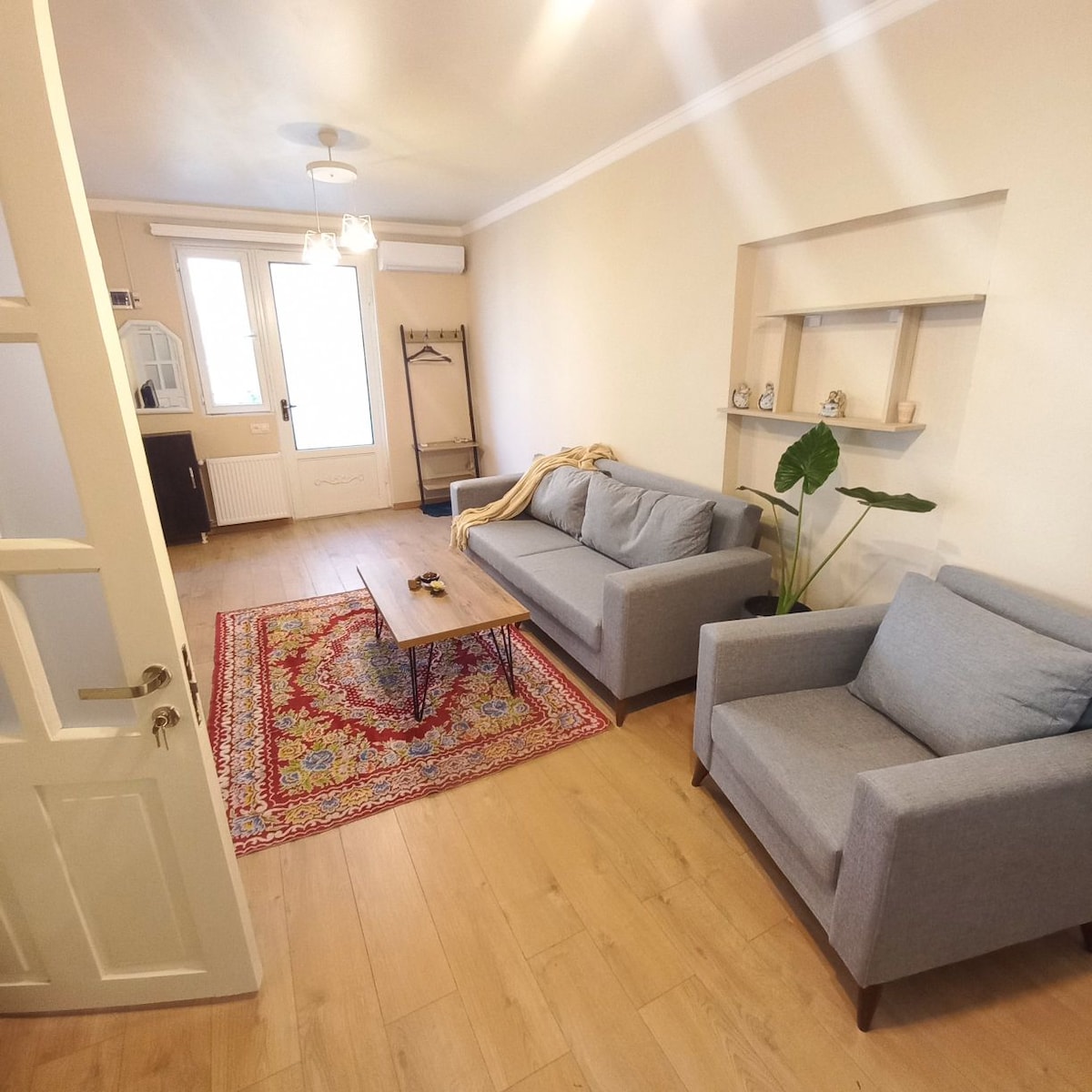 A cozy apartment located in the historic center of Tbilisi opens up to picturesque sights that is a piquant mix of modern and antique architectural sites such as: ancient Cathedrals, exclusive Tbilisi designs, the Peace Bridge and the Palace of the President. The apartment is in a vintage two-floor building and occupies the firs floor. It has two bedrooms, a living room and a bathroom. What makes it amazing is the access to a lovely petite garden.