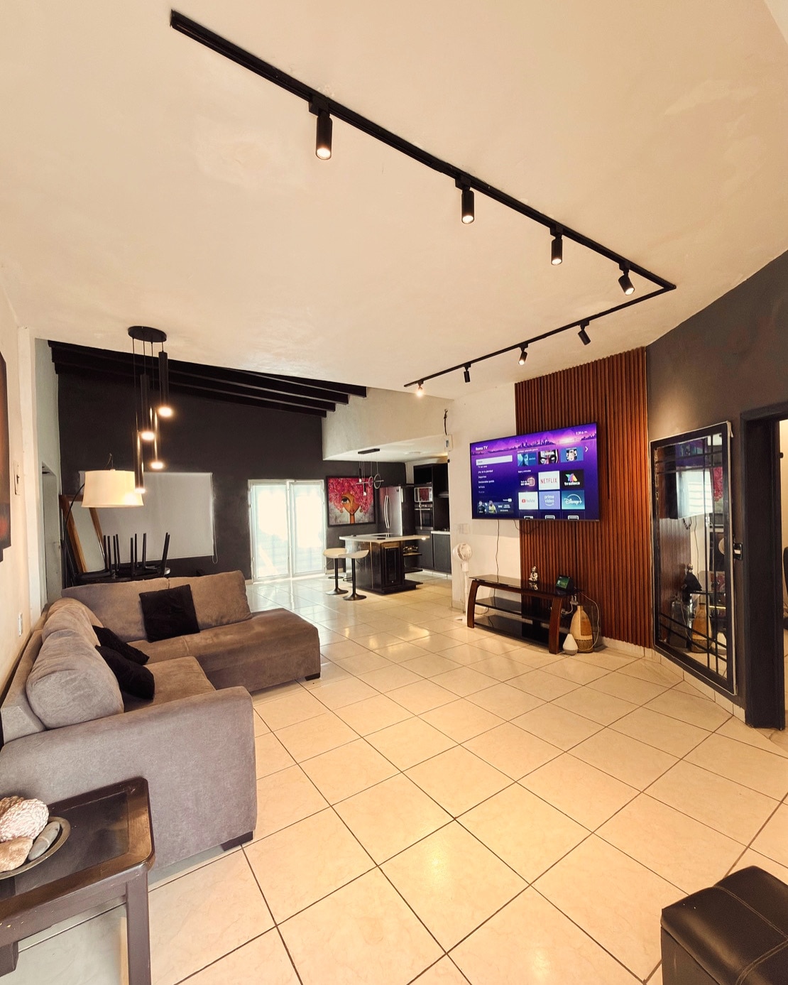 Cómoda, bonita e impecable casa moderna que goza de grandes espacios para disfrutar, descansar y relajarte. Excelente ubicación, se encuentra a muy corta distancia de tiendas, supermercados y restaurantes. La casa cuenta con: ~Recámara con A/C ~Ventanales panorámicos al área de piscina ~Cocina completa con utensilios básicos ~Comedor principal ~Comedor al aire libre en área de la piscina ~Sofás en área de TV. ~Piscina (Privada) ~Gimnasio ~2 Baños completos (planta alta y baja) *No Mascotas