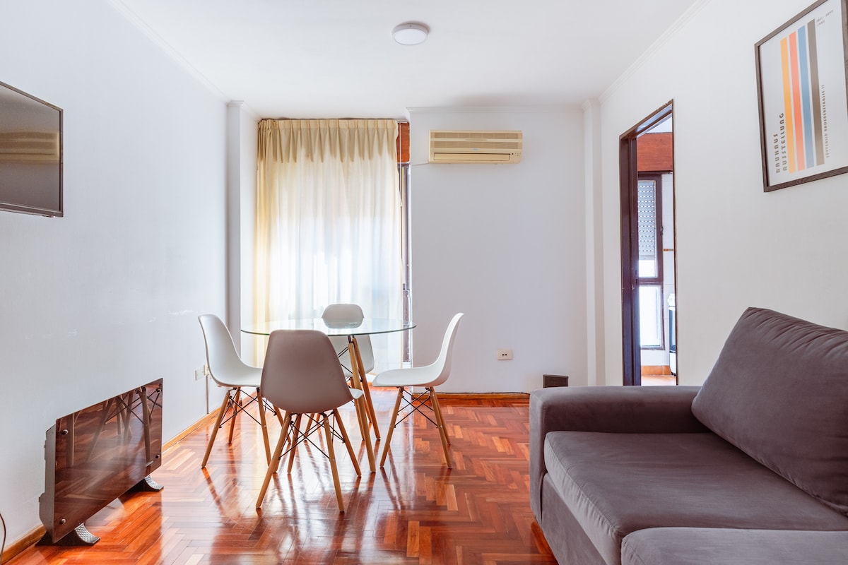 Luminoso y moderno departamento ubicado frente al parque, al rededor de multiples comercios, totalmente equipado para 2 personas. Cuenta con aire acondicionado, calefaccion a caldera, ventilador, TV con cable y WiFi, espacio de trabajo, cocina equipada con cafetera, tostadora, microondas, etc. baño con antebaño, secadora de pelo, biblioteca con libros de autores cordobeses, kit de primeros auxilios/botiquín y de costura,etc. El departamento es a estrenar y está equipado para largas estancias.