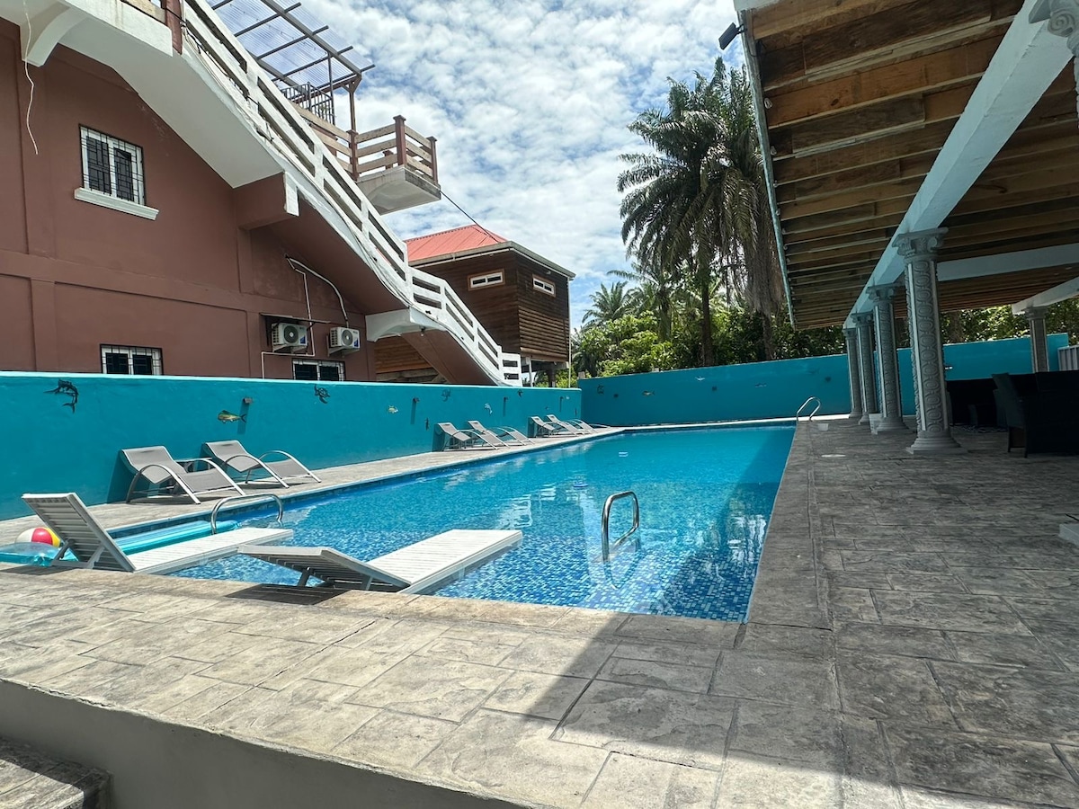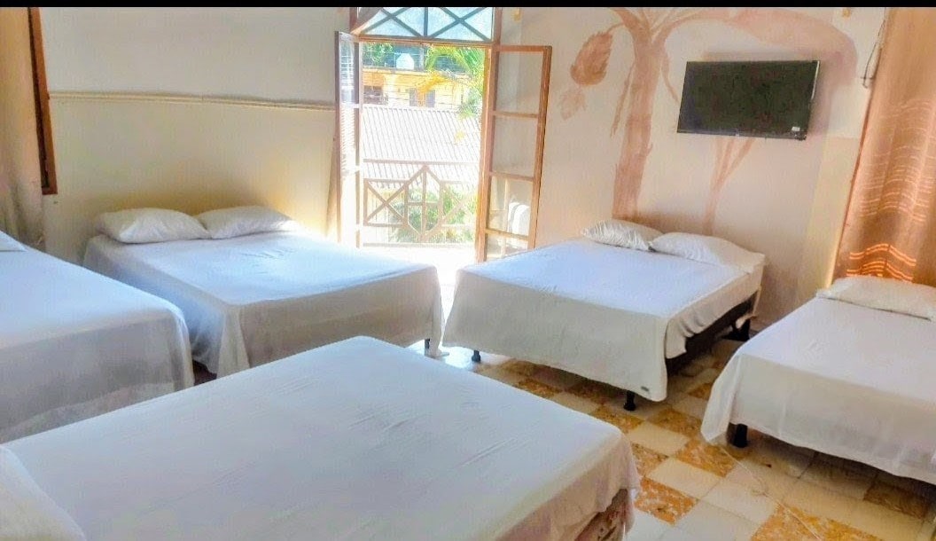 DESAYUNO INCLUIDO No querrás irte de este lugar tan lindo. Tenemos Restaurante, Recepción de Hotel, Piscina y Terraza. Ubicados en Tela zona Céntrica muy cerca de todo. Playa: 1.3km Acuario Telamire: 2km Plaza Comercial: 300m a 4min caminando, aqui encuentras Cafés, Supermercado, Farmacia, Bancos etc. Contamos con : Wifi Aire acondicionado Televisión por cable Agua caliente Seguridad privada Aseo de habitación diaria Piscina
