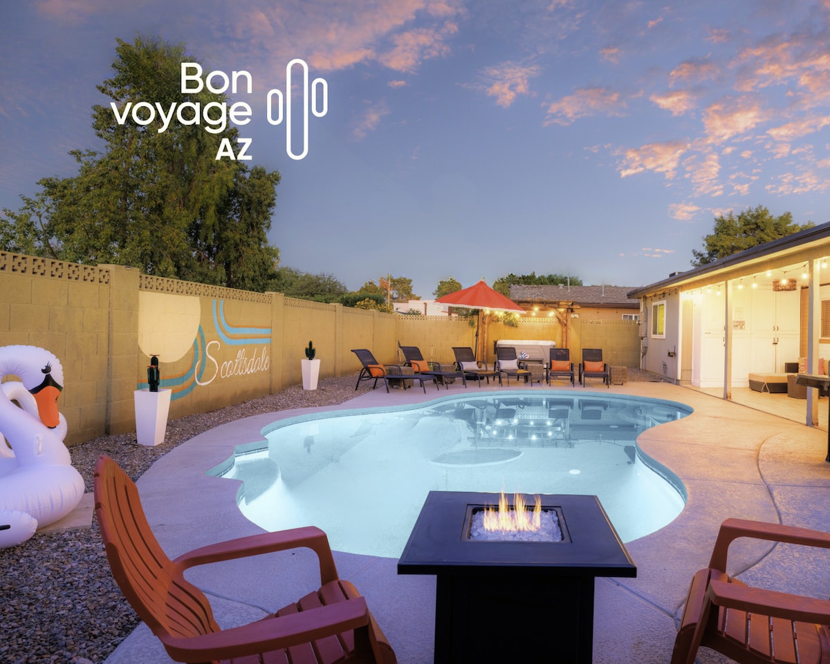 Reliably operated by a top AZ Superhost with 4,400+ 5 star stays. Everything inside and out is updated and carefully curated by a team of local designers. Three bedrooms, fully stocked gourmet eat-in kitchen. Spacious, private resort-like yard with a heated pool, BBQ and outdoor dining. Sitting area out front with sunset views of iconic Camelback Mountain. Quiet residential neighborhood less than a mile walk to Old Town Scottsdale and 11+ mile greenbelt. Garage w/ EV charger. INCLUDED 👇