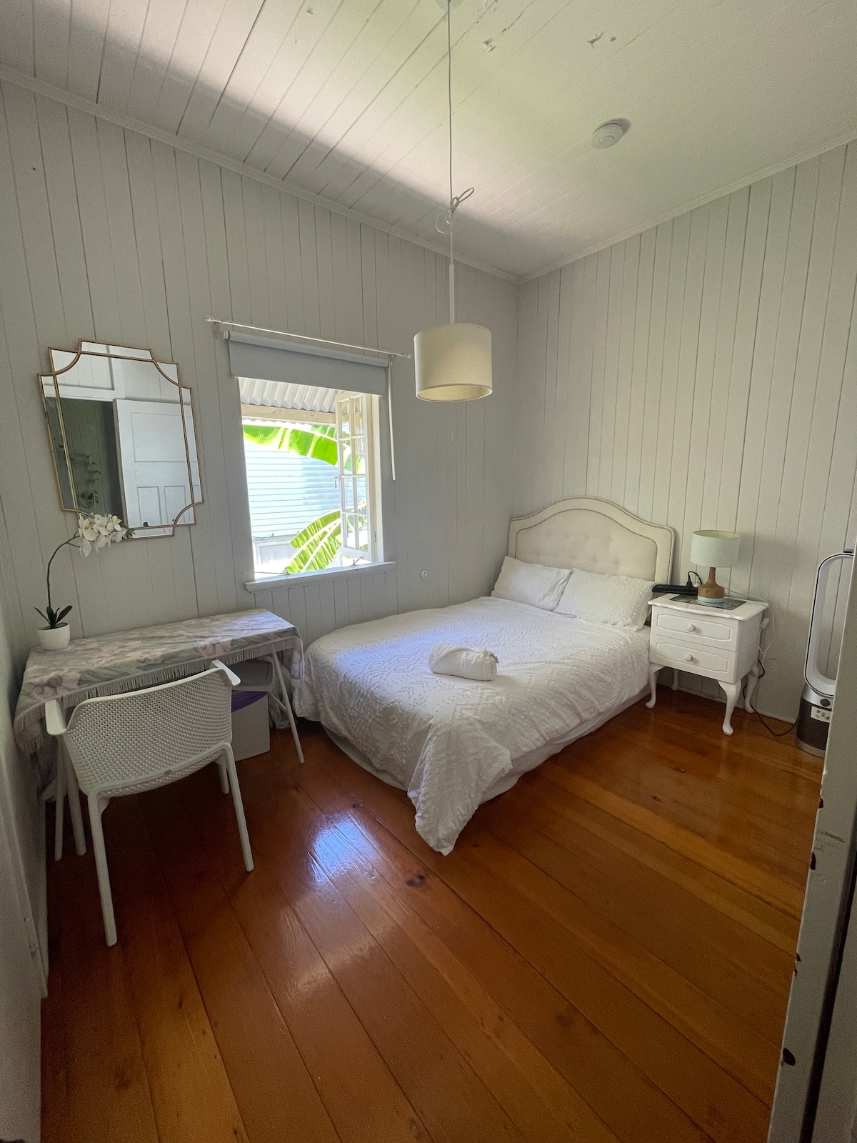 This beautiful eco tiny house is a modern version of the traditional Australian shed. It is built entirely by hand, complete with restored furniture & bamboo floors. Surrounded by greenery, it is split-level, with a mezzanine bedroom, small modern kitchen & bathroom. Its private but not totally secluded as you will sometimes see one of us walk past. NB: Brisbane can be hot & humid from November to March. There is a fan but no air conditioning, so this may be a consideration for some guests.