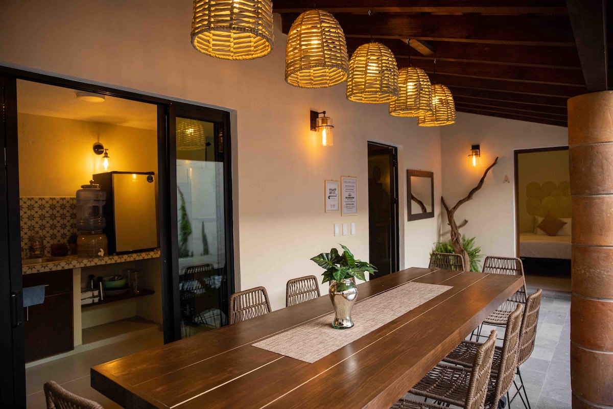 En la casa de los mangos 🏡 🥭 experimentarás la tranquilidad de lo que es vivir en un pueblo mágico, con habitaciones cómodas y un lindo jardín con terraza y áreas verdes en donde te sentirás identificado con la naturaleza 🍃 . Además de estar a 10 min de la plaza sin necesidad de utilizar tu vehículo. Si deseas preparar alimentos y compartir con tus amigos, familia, contarás con una cocina equipada que te hará sentir en casa.En caso de querer probar el sazón de la ciudad, no dudes en preguntar.